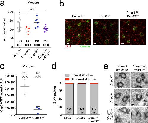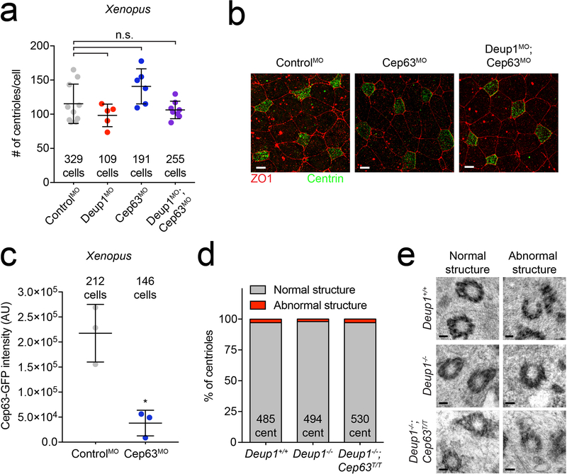 Extended Data Fig. 6:. Deup1 and Cep63 are dispensable for centriole amplification in Xenopus.(a) Quantification of centriole number in Xenopus epithelial cells treated with Cep63 or Deup1 and Cep63 morpholinos. Data from control and Deup1 morpholinos are from Extended Data 2d and shown for comparison. Points represent the average number of centrioles per cell in one embryo. n ⥠5 embryos/genotype. The total number of cells analyzed per condition is indicated. P values, unpaired, two-tailed, Welchâs t-test. n.s. = not statistically significant (p > 0.05). Bars represent mean + SD.(b) Representative immunofluorescence images from control, Cep63 or Deup1 and Cep63 morpholino treated Xenopus epithelial cells stained with tight junction marker, ZO1, and centriole marker, Centrin. Scale bars represent 10 μm.(c) Quantification of Cep63-GFP intensity in control and Cep63 morpholino-treated Xenopus epithelial cells. Note, the Cep63 MO efficiently silenced expression of an mRNA encoding a morpholino-targetable Cep63 fused to GFP in Xenopus MCCs. n = 3 embryos/genotype. The total number of cells analyzed per condition is indicated. P values, unpaired, two-tailed, Welchâs t-test. * = p ⤠0.05. Bars represent mean + SD.(d) Quantification of the percent of centrioles with normal or abnormal structure in Deup1+/+, Deup1â/â and Deup1â/â; Cep63T/T ependymal cells. n > 30 cells/genotype. The total number of centrioles analyzed per genotype is indicated.(e) Representative TEM images of normal and abnormal centrioles in Deup1+/+, Deup1â/â and Deup1â/â; Cep63T/T ependymal cells. Scale bar represents 100 nm. |