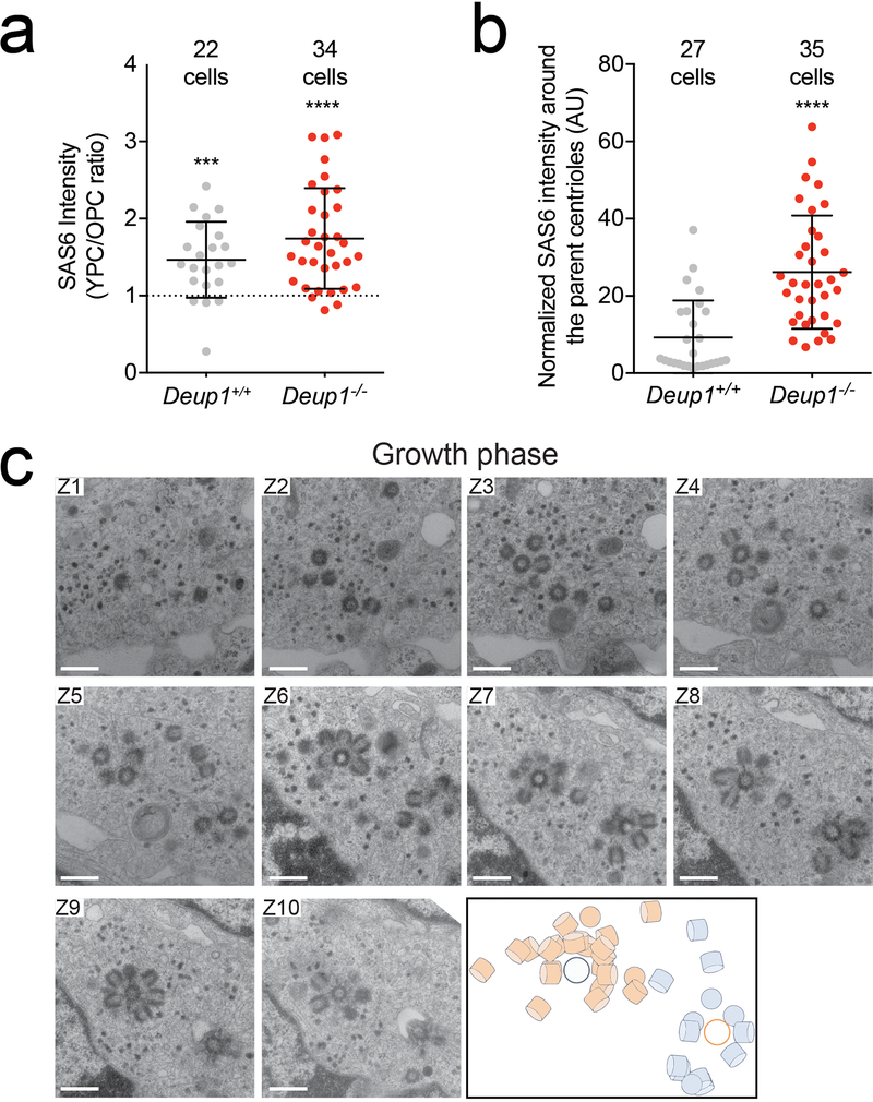 Extended Data Fig. 4:. Procentrioles form in the vicinity of parent centrioles in cells that lack deuterosomes.(a) Quantification of the ratio of SAS6 intensity at the younger parent centriole (YPC) compared to the older parent centriole (OPC) in ependymal cells in vivo (P2-P6) during A-phase. GT335 staining was used to mark the cilium that forms from the older parent centriole. n = 3 mice/genotype. P values, one sample t-test compared to the value of 1, which represents identical SAS6 intensity levels at the YPC and OPC. *** = p ⤠0.001, **** = p ⤠0.0001.(b) Quantification of SAS6 intensity on parent centrioles in Deup1+/+ and Deup1â/â ependymal cells in amplification phase in vivo (P2-P6). The SAS6 signal associated with the two parent centrioles was summed together and normalized to background SAS6 staining of the same cell. n = 3 mice/genotype. P values, unpaired, two-tailed, Welchâs t-test. **** = p ⤠0.0001. All bars represent mean +/â SD.(c) Serial EM images of a Deup1â/â ependymal cell in the growth phase from basal (Z1) to apical (Z10). Note the increase in centriole amplification on, and in the vicinity of, the parental centrioles. Bottom right shows a schematic representation of the relative position of procentrioles formed by the parent centrioles. Scale bar represents 500 nm. |