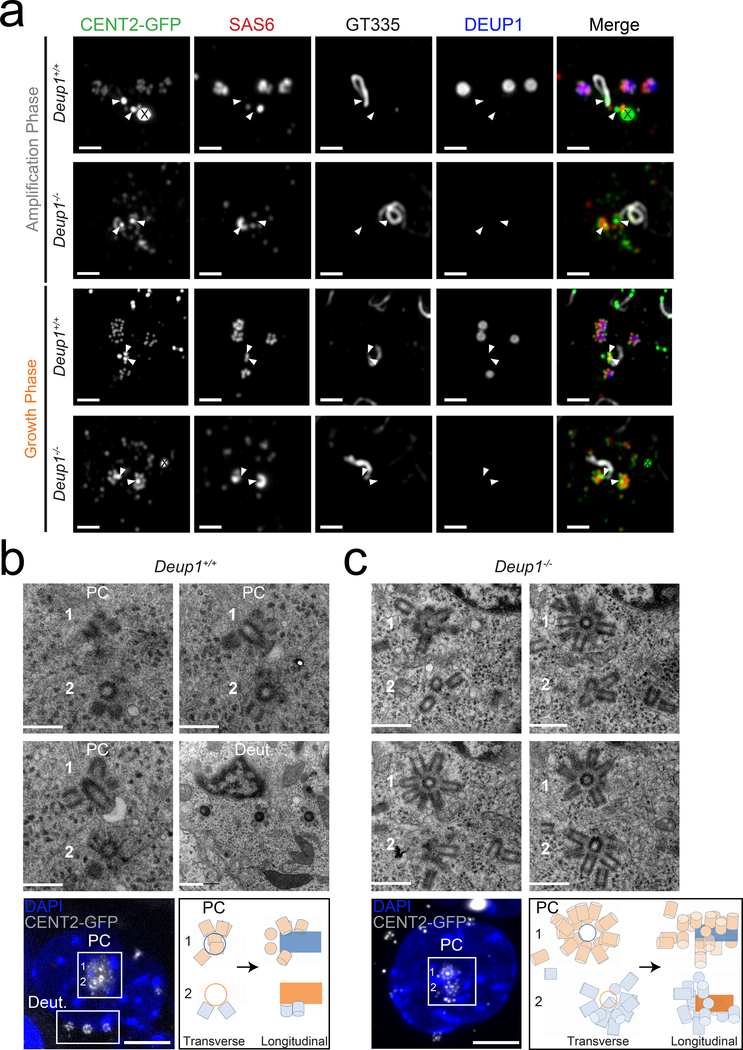 Fig. 4. Centriole amplification in the absence of deuterosomes occurs on, and in proximity to, pre-existing centrioles.(a) Immunofluorescence images of Centrin 2-GFP expressing Deup1+/+ and Deup1â/â ependymal cells in vivo (P2-P6). Brain sections were stained with antibodies against GT335, SAS6, and DEUP1. GT335 marks the cilium that forms from the older parent centriole, SAS6 marks new procentrioles and DEUP1 marks the deuterosome. X marks Centrin 2-GFP aggregates resulting from expression of the Centrin 2-GFP transgene25. Arrowheads indicate location of pre-existing centrioles. Scale bars represent 2 μm.(b) Correlative light and electron microscopy of a Centrin 2-GFP expressing Deup1+/+ ependymal cell in the growth phase. Procentrioles are formed by both parent centrioles (PC) and deuterosomes (Deut.). Bottom left shows an immunofluorescence image of the Centrin 2-GFP Deup1+/+ cell depicted in the EM images. Bottom right shows a schematic representation of the relative position of procentrioles formed on the parent centrioles. Scale bars represent 600 nm for the EM images and 5 μm for the immunofluorescence image. This cell is shown in Supplementary Video 3.(c) Correlative light and electron microscopy of a Centrin 2-GFP-expressing Deup1â/â cell reveals centriole amplification on, or in close proximity to, the parent centrioles (PC). Procentrioles are also observed further away in the cytoplasm. Bottom left shows an immunofluorescence image of the Centrin 2-GFP Deup1â/â cell depicted in the EM images. Bottom right shows a schematic representation of the relative position of procentrioles formed on the parent centrioles. Scale bars represent 600 nm for the EM images and 5 μm for the immunofluorescence image. This cell is shown in Supplementary Video 4 and 5. |