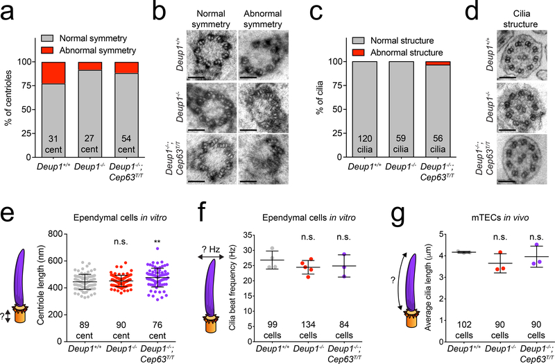 Fig. 5. Loss of Deup1 does not compromise basal body structure or cilia function(a) Quantification of the percent of centrioles from in vitro ependymal cells with abnormal symmetry in Deup1+/+, Deup1â/â and Deup1â/â; Cep63T/T cells. n > 10 cells/genotype. The total number of centrioles analyzed per genotype is indicated.(b) Representative TEM images of normal and abnormal symmetry observed in centrioles in Deup1+/+, Deup1â/â and Deup1â/â; Cep63T/T ependymal cells in vitro. Scale bar represents 100 nm.(c) Quantification of the percent of cilia with abnormal structure in fully differentiated Deup1+/+, Deup1â/â and Deup1â/â; Cep63T/T ependymal cells in vitro. n > 5 cells/genotype. The total number of cilia analyzed per genotype is indicated.(d) Representative TEM images of normal cilia in fully differentiated Deup1+/+, Deup1â/â and Deup1â/â; Cep63T/T ependymal cells in vitro. Scale bar represents 100 nm.(e) Centriole length quantification via TEM in fully differentiated Deup1+/+, Deup1â/â and Deup1â/â; Cep63T/T ependymal cells. n > 10 cells/genotype. Each point represents a single centriole. The total number of centrioles analyzed per genotype is indicated. P values, unpaired, two-tailed, Welchâs t-test. n.s. = not statistically significant (p > 0.05); **: p ⤠0.01. Bars represent mean +/â SD.(f) Quantification of ciliary beat frequency measured in fully differentiated Deup1+/+, Deup1â/â and Deup1â/â; Cep63T/T ependymal cells. n = ⥠3 cultures/genotype. The total number of cells analyzed per genotype is indicated. P values, unpaired, two-tailed, Welchâs t-test. n.s. = not statistically significant (p > 0.05). Bars represent mean +/â SD.(g) Quantification of cilia length measured using scanning electron microscopy of Deup1+/+, Deup1â/â and Deup1â/â; Cep63T/T mTECs in vivo. The total number of cells analyzed per genotype is indicated. P values, unpaired, two-tailed, Welchâs t-test. n.s. = not statistically significant (p > 0.05). Bars represent mean +/â SD. |