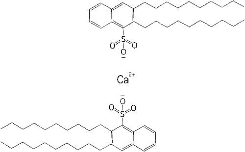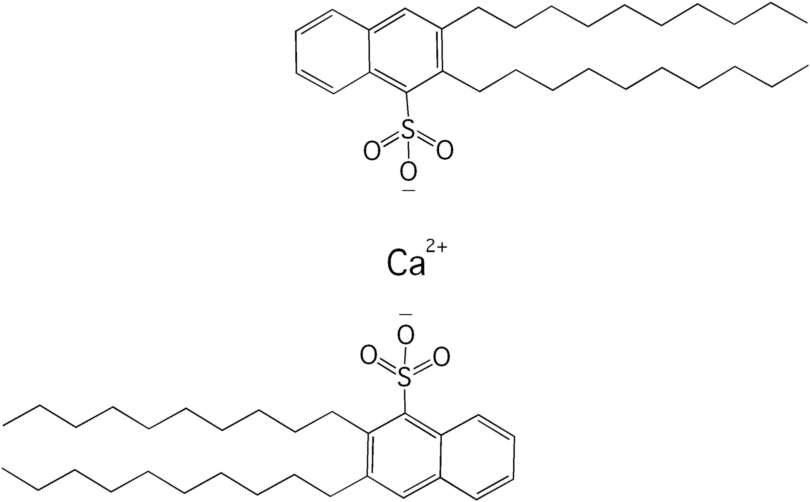 Fig. 1. Chemical structure of calcium dinonylnaphthalenesulfonate (CaDNS). It is composed of two identical sub-units, which each include a naphthalene molecule, carbon side-chains, and sulfonic acid components.