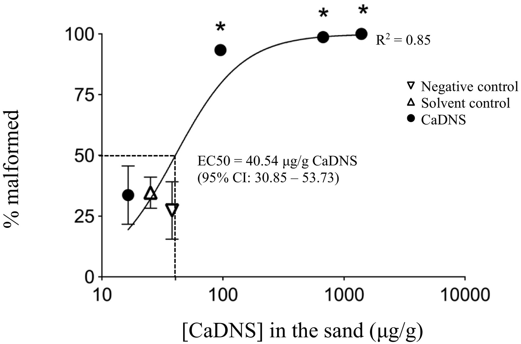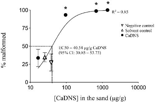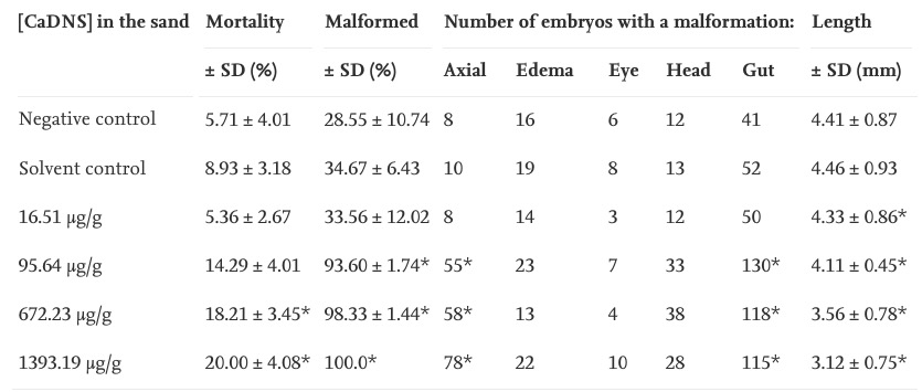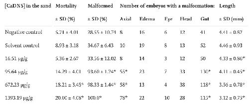 Table 2. Lethal and observable sub-lethal effects in Silurana tropicalis embryos exposed to CaDNS. Means are presented ± standard deviation (SD) except for the specific malformations are presented as a total count for that treatment. An asterisk (*) represents a significantly different value compared to the solvent control.