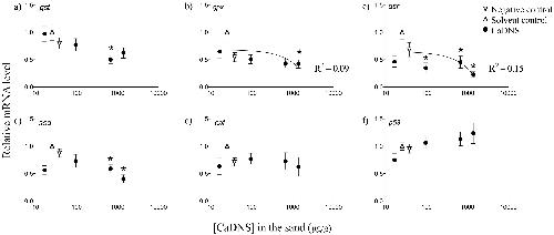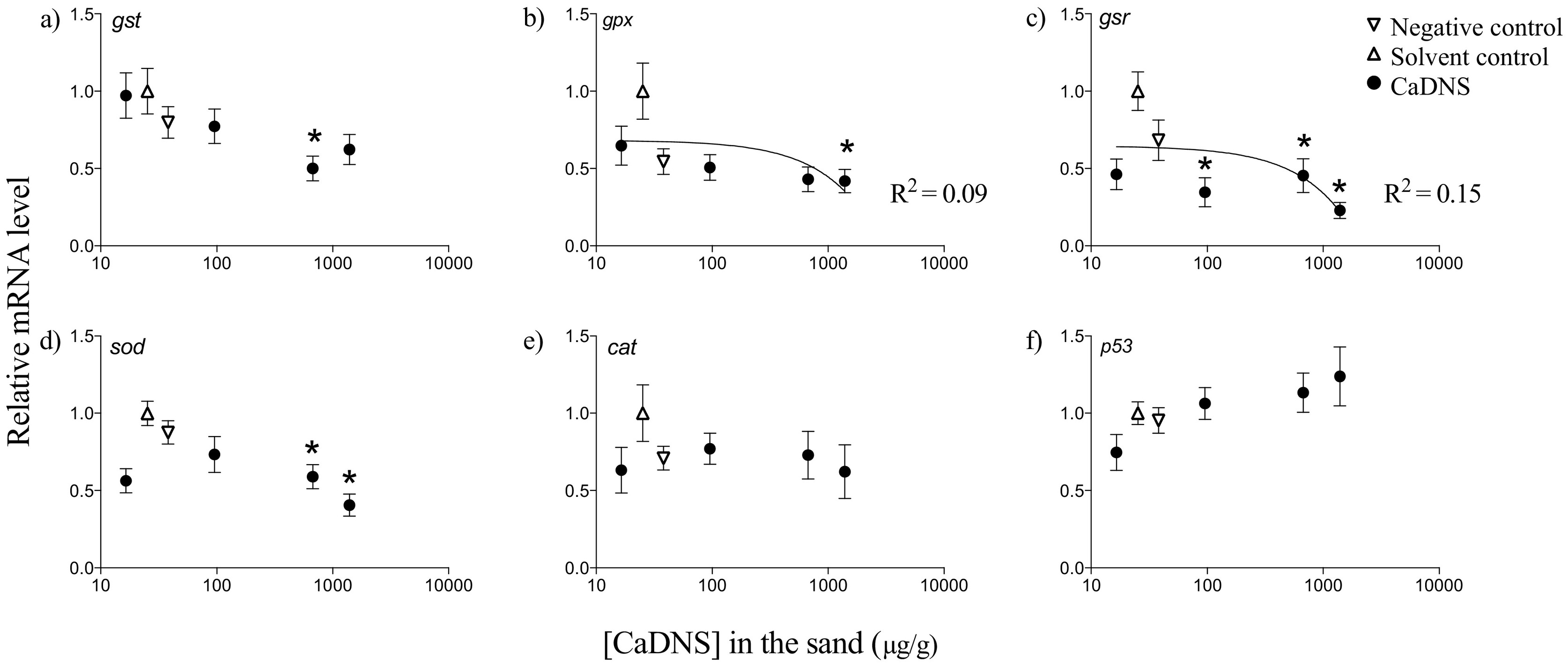Fig. 3. Relative mRNA levels in genes involved in oxidative stress defense including a) glutathione S-transferase (gst), b) glutathione peroxidase (gpx), c) glutathione reductase (gsr), d) superoxide dismutase (sod), and e) catalase (cat), and the f) tumor suppressing protein (p53) in Silurana tropicalis embryos exposed to calcium dinonylnaphthalenesulfonate (CaDNS) for 72 h. Data are presented as mean ± SEM. Data were analyzed using a one-way ANOVA (n = 10). Significance compared to the solvent control is noted with an asterisk (*, p < 0.05).
