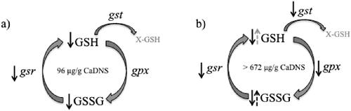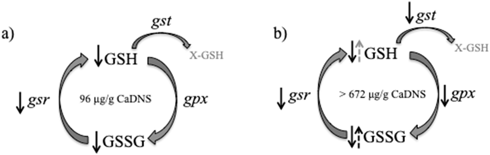 Fig. 4. Alterations to the glutathione redox cycle in Silurana tropicalis embryos exposed to a) 96 μg/g calcium dinonylnaphthalenesulfonate (CaDNS) compared to the solvent control and to b) over 672 μg/g CaDNS compared to the solvent control (solid arrows) or compared to lower exposure of CaDNS (dotted arrows). Black arrows represent significant difference (p < 0.05) and grey arrows represent an insignificant change. Capital letters represent metabolites measured and lower-case italics represent gene expression of the enzymes. Grey text was not measured in this study. Glutathione (reduced form, GSH), glutathione disulfide (oxidized form, GSSG), glutathione S-transferase (gst), glutathione peroxidase (gpx), glutathione reductase (gsr).