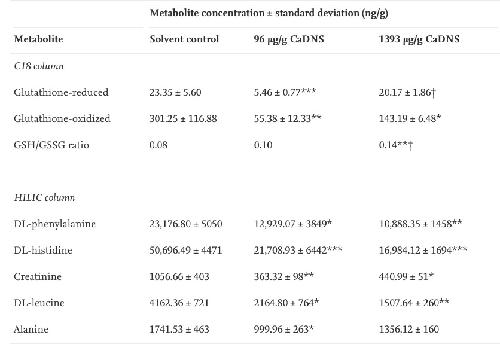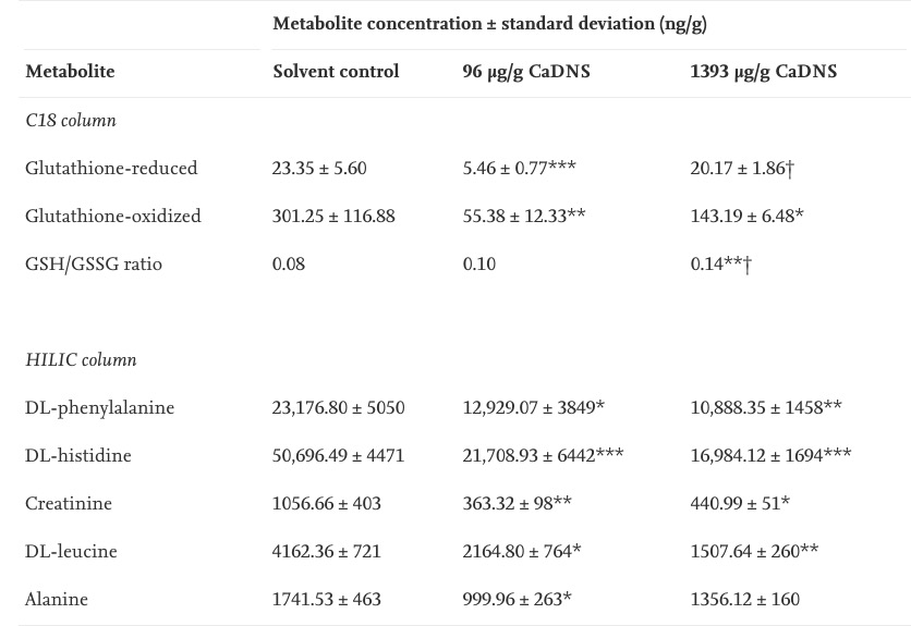 Table 3. Concentration of metabolites detected in Silurana tropicalis embryos exposed to solvent control, 96 μg/g, or 1393 μg/g calcium dinonylnaphthalenesulfonate (CaDNS) in the sand. Significant difference from solvent control is indicated with an asterisk (* p < 0.05, ** p < 0.01, *** p < 0.001) and from 96 μg/g is indicated with a dagger († p < 0.05).