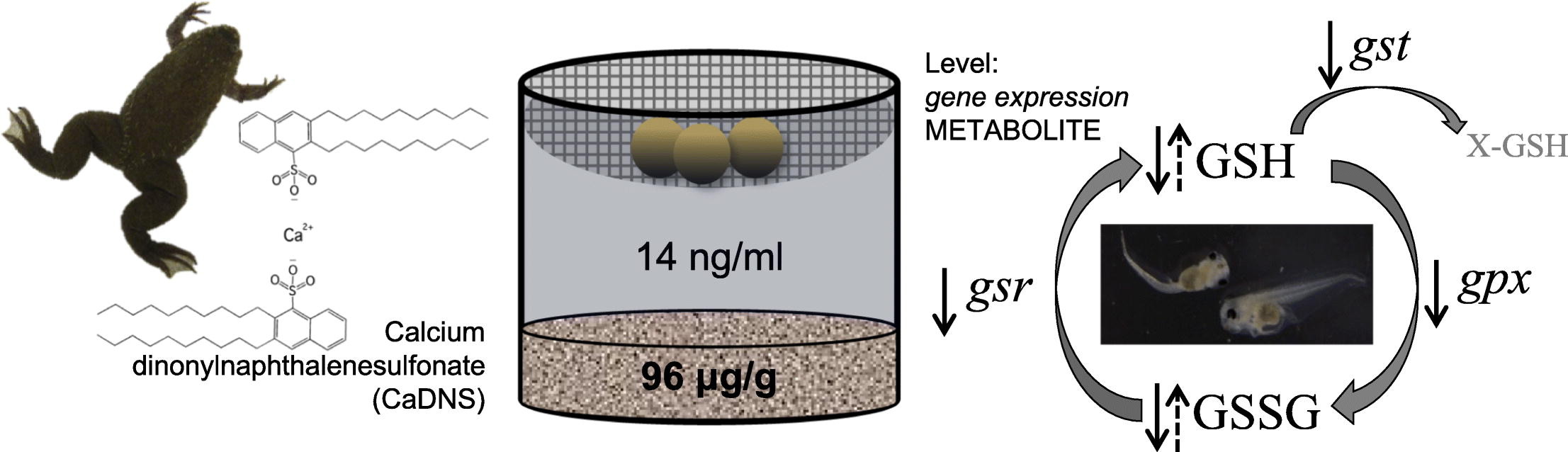 Naphthalene sulfonic acids (NSAs) are used as additives in lubricants, dyes, and greases and commonly act as surfactants in many industrial processes. The calcium salt of dinonyl NSA (calcium dinonylnaphthalenesulfonate; CaDNS) is listed among thousands of chemicals identified as priorities for assessment by the Government of Canada's Chemical Management Plan due to the limited toxicity data. The purpose of this study was two-fold: 1) to establish the toxicity of CaDNS to Western clawed frog (Silurana tropicalis) embryos and 2) to assess the sub-lethal effects and mechanisms of toxicity of CaDNS in amphibians through targeted gene expression and metabolite analyses. Frog embryos were exposed to water overlying sand spiked with a range of concentrations of CaDNS (17-1393 μg/g) over a 72-h period. Results indicated significantly higher mortality and presence of malformations in frog larvae exposed to over 672 μg/g CaDNS in the sand (14 ng/mL CaDNS in the water) compared to control treatments. An overall decrease in the glutathione redox cycle was observed, including decreases in relative mRNA levels of enzymes (glutathione S-transferase (gst), glutathione reductase (gsr), glutathione peroxidase (gpx)) and decreases in the glutathione (GSH) and glutathione disulfide (GSSG) metabolite concentrations. In addition, transcript levels of genes involved in antioxidant capacity and essential amino acid metabolites decreased significantly in embryos exposed to low levels of CaDNS. This is the first study to assess the toxicity of NSAs in amphibians, contributing important data to aid in the assessment of NSAs.