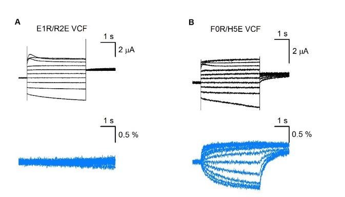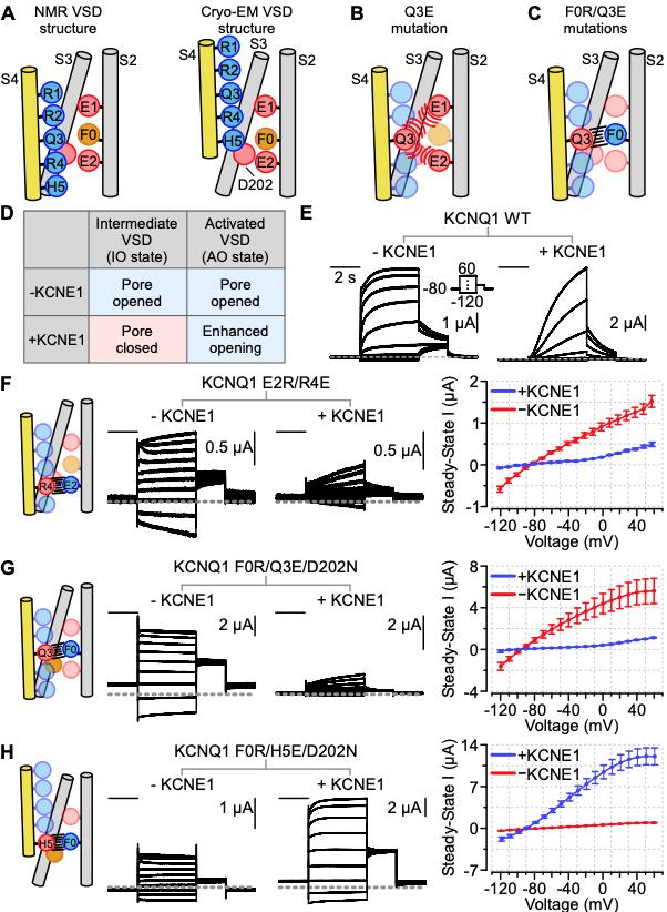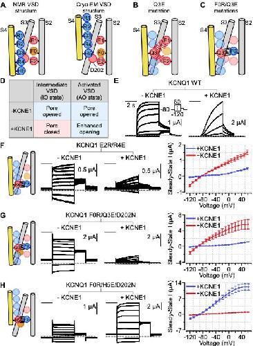 Figure 5. Schematics and electrophysiology data validating the intermediate and activated KCNQ1 VSD functional states utilizing auxiliary subunit KCNE1 regulation as a probe. Amino acid residue nomenclature: E2 = E170, R4 = R237, F0 = F167, Q3 = Q234, and H5 = H240. Numbering corresponds to the human KCNQ1 sequence. All error bars are ±SEM. All horizontal scale bars correspond to 2 seconds. (A) A cartoon schematic illustrating key S2, S3, and S4 residues interactions found in the NMR and cryoEM VSD structures. Positive and polar gating residues on S4 (R1-H5) are colored blue, negative counter charges on S2 (E1, E2) and S3 (D202) are colored red, and the hydrophobic plug on S2 (F0) is colored orange. (B) A cartoon schematic displaying how the S4 charge-reversal mutation (Q3E) disrupts VSD function. Q3E mutation creates electrostatic repulsion with the negative counter charges (E1, E2) and leads to VSD loss of function. (C) A cartoon schematic showing how the double charge reversal mutations Q3E/F0R biases VSD conformation. The double mutations ensure that electrostatic interactions between S2 and S4 are only favorable when the two mutation sites are in alignment (Q3E-F0R). (D) Table detailing KCNE1 effect on the KCNQ1 pore domain associated with the intermediate or activated VSD states based on prior studies. KCNE1 suppresses the IO state current by decrease open probability, while enhancing the AO state current, in part by increasing unitary conductance11,12,19. (E) Representative current recordings from the KCNQ1 channel without (left) and with (right) KCNE1 co-expression. The voltage protocol is shown in the inset and applies to all exemplars in this figure. (F-H) Left: Cartoon schematic of the double-charge reversal mutation and the predicted S2-S4 registry for the mutant tested. Middle: Exemplar currents for the mutant recorded with and without KCNE1 co expression. Right: Average steady-state current vs. voltage (IV) curves for the respective mutants in the absence or presence of KCNE1 co-expression. The inset in panel E shows the voltage protocol. n = 5 (F), 5 (G), 6 (H). Currents were collected with 10 mV interval, but examples are shown with 20 mV interval for clarity. |