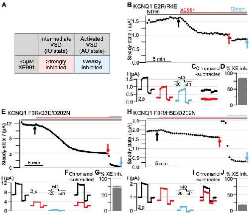 Figure 6. Electrophysiology validating the intermediate and activated KCNQ1 VSD functional states utilizing XE991 pharmacology as a probe. Amino acid residue nomenclature and numbering and error bars are similar as in Figure 5. (A) Table outlining 5 µM XE991 effect on KCNQ1 IO and AO state currents based on prior studies11. (B) Top: Exemplar diary plots of E2R/R4E drug studies demonstrating current amplitude over time. Cells were held at -20 mV and pulsed to +40 mV for 4 seconds and -40 mV for 2 seconds every 20 seconds. Each dot plots the steady-state current amplitude at the end of the 4-seconds +40 mV test pulse. Cells were recorded in ND96 solution and the top bars indicate application of 5 μM XE991 (red) and 150 μM chromanol 293B (blue). Scale bar indicates 5 minutes. Bottom: Current traces for the E2R/R4E mutant in control ND96 solution (black), in solution containing 5 μM XE991 (red), and in solution containing 150 μM chromanol 293B (blue). The arrows in the diary plot indicate respective traces shown. Note that because the holding potential was -20 mV and the mutant channels are constitutively open, non-zero currents were observed before the test pulse. (C) Chromanol-subtracted E2R/R4E currents under control (black) and 5 μM XE991 (red) conditions for the traces shown in panel B. The chromanol-subtracted currents were calculated by subtracting current after chromanol application (blue, panel B) from the control current (black, panel B) and the current after XE991 application (red, panel B). Percent E2R/R4E current inhibition by XE991 was calculated from the chromanol-subtracted currents using the ratio between the steady-state current amplitude under XE991 and control conditions (see Methods). (D) Average percent inhibition of the E2R/R4E currents by 5 μM XE991, as quantified by the chromanol-subtracted currents (n = 6). Error bar indicates SEM and applies to all error bars in this figure. (E-J) Same as panels B-D, but showing results for KCNQ1 F0R/Q3E/D202N and F0R/H5E/D202N mutants (n = 6 for both mutants). |