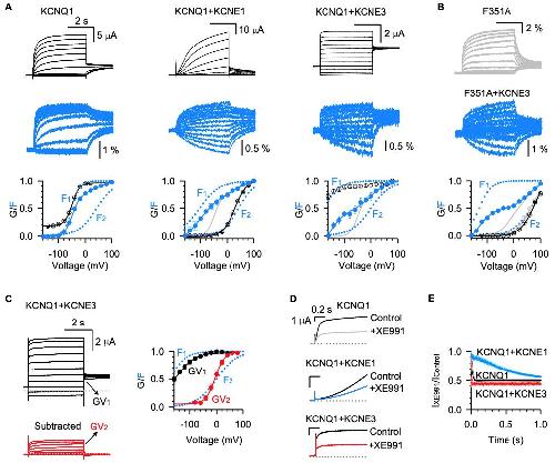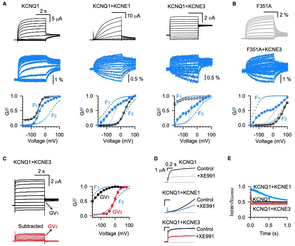 Figure 7. KCNE3 shifts the voltage dependence of the intermediate-open state to render its conductance relevant under physiological conditions. (A) Voltage-clamp fluorometry recordings for pseudo-WT (C214A/G219C/C331A) KCNQ1 (left), KCNQ1+KCNE1 (middle), and KCNQ1+KCNE3 (right). Current (black) and fluorescence (blue) were recorded with voltages from -160 mV to +100 mV in 20 mV increments and then back to -40 mV. The bottom panels are the GâV (black) and FâV (blue) relationships with F1 and F2 components (dotted lines). The FâV relationship for KCNQ1 (gray) is also shown in KCNQ1+KCNE1 and KCNQ1+KCNE3 for comparison. (B) VCF recordings for KCNQ1-F351A in the presence (blue) and absence (gray) of KCNE3. The bottom of this panel shows the GâV and FâV relationships for KCNQ1-F351A (gray) and KCNQ1-F351A+KCNE3 (blue). (C) Left: WT KCNQ1+KCNE3 currents (black) with voltages from -120 mV to +80 mV in 20 mV increments and back to -40 mV to test the tail current. The red traces are total KCNQ1+KCNE3 currents with the instantaneous current subtracted, which show typical time- and voltage-dependent activation. Right: The two steps of KCNQ1+KCNE3 voltage sensor activation, F1 and F2, are shown in blue, while transitions of the two conductive states are shown in black (GV1) and red (GV2). (D) Overlays of stabilized currents in control solutions (black traces for all channels) and after applying 5 µM XE991 for KCNQ1 (grey), KCNQ1+KCNE1 (blue), and KCNQ1+KCNE3 (red). (E) Time-dependent inhibition of 5 µM XE991 of KCNQ1 (black), KCNQ1+KCNE1 (blue), and KCNQ1+KCNE3 (red). Time-dependent inhibition was calculated by dividing the stabilized currents in solutions containing 5 µM XE991 by that of control at the same time point. X-axis is the time after the start of the +40 mV test pulse. In all cases, n ⥠3. |