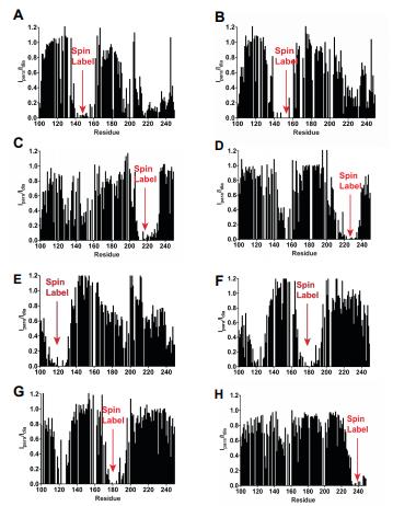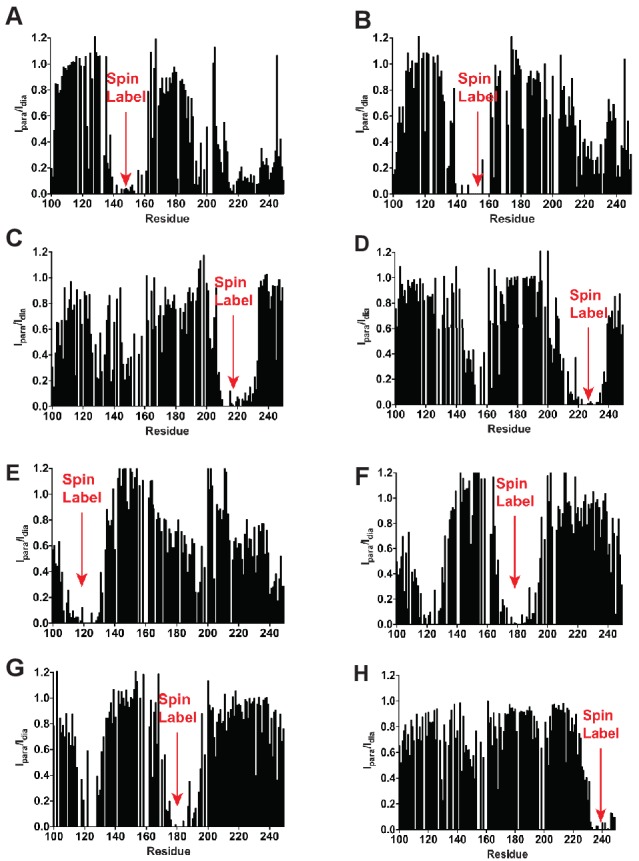 Figure 1-figure supplement 1. Long range PREs are consistent with the expected KCNQ1 VSD topology in LMPG micelles. The residue positions of the spin-labeled cysteines for each sample are : (A) 144-SL (B) 155-SL (C) 214-SL (D) 224-Sl (E) 121-SL (F) 177-Sl (G) 180-SL (H) 238-SL. |