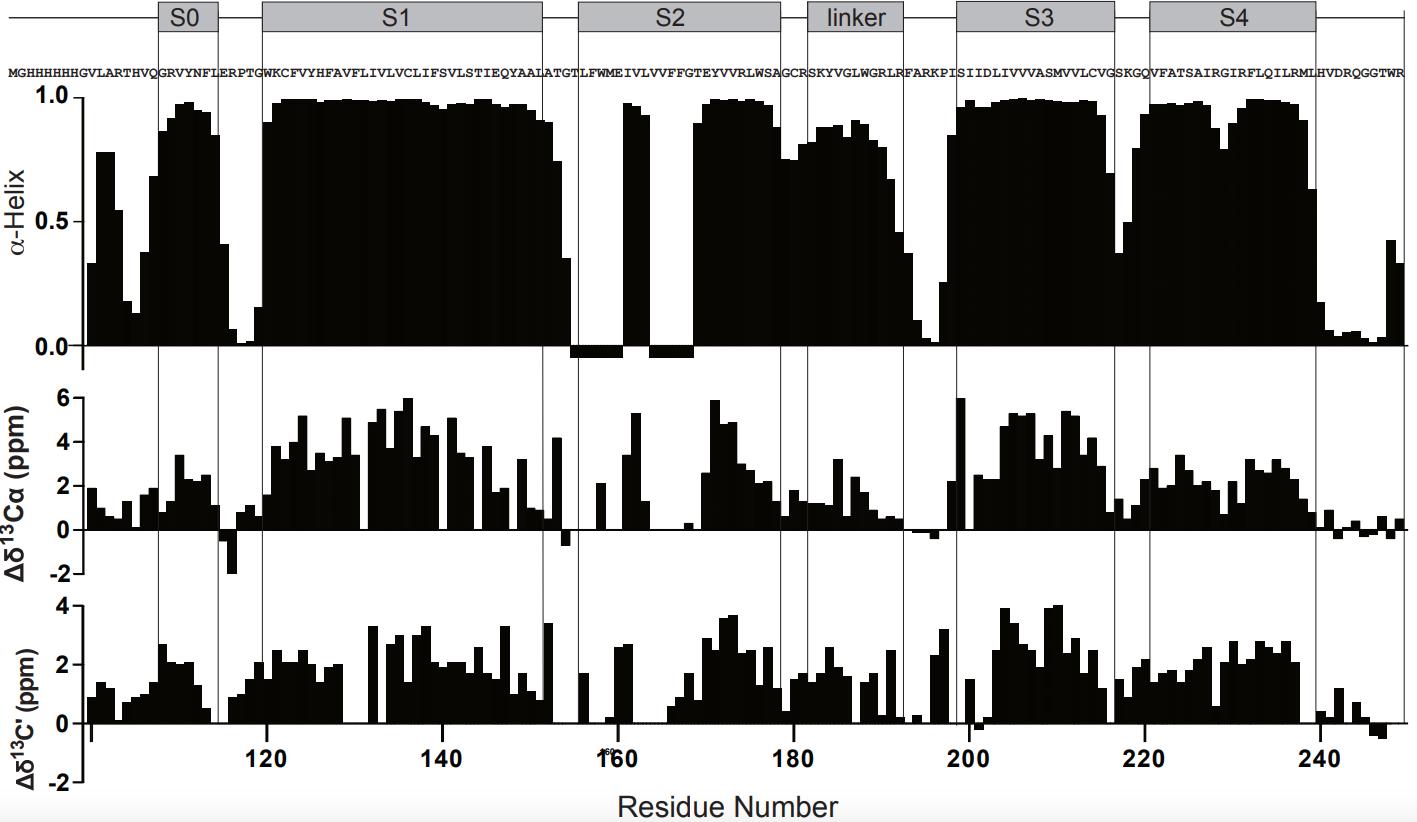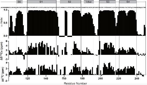 Figure 1âfigure supplement 2. TALOS-N secondary structure analysis of backbone chemical shifts (top panel) and (bottom panels) deviations of the (Osteen et al., 2012) Cα and carbonyl 13Câ chemical shifts from random coil values.The chemical shift data for the KCNQ1 VSD been deposited in BioMagResBank (BMRB ID 30517).Figure 1âfigure supplement 2âsource data 1. Excel file with numerical data used for Figure 1âfigure supplement 2. |