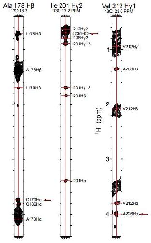 Figure 1—figure supplement 3. Examples of NOE measurements.Example strip plots showing long-range methyl-methyl and methyl-backbone Hα proton NOEs (red arrows) taken from the methyl-optimized 3D 13C-edited NOESY recorded on a 13C,15N-labeled sample in deuterated LMPG. The chemical shift assignments illustrated in this figure have been deposited in BioMagResBank (BMRB ID 30517). |