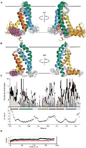 Figure 2—figure supplement 1. KCNQ1-VSD XplorNIH-determined structural ensemble, before and after molecular dynamics refinement.(A) The ensemble is comprised of the top 15 lowest energy structures out of 150 conformations generated by NMR data-restrained XPLOR-NIH calculations (no bilayer). The transmembrane helices S1, S2, S3, and S4, are colored bluish green, yellow, vermillion, and sky blue respectively. The S2-S3 linker and S0 helices are colored orange and reddish purple. The loop between S1 (bluish green) and S2 (yellow) appears disordered due to lack of NMR-derived restraints. This does not necessarily mean this region does not adopt stable secondary structure. The approximate position of the membrane is indicated by a pair of gray lines. (B) The unrestrained molecular dynamics refined ensemble (MD carried out in an explicit hydrated DMPC bilayer) colored as in panel A (corresponding to PDB ID 6MIE containing 10 conformers). (C) The upper panel shows the total number of distance restraints per residue. For NOE-derived restraints that define a distance between two atoms in different residues, each residue receives a count of 0.5 per restraint. Long range, medium, and sequence distance restraints are colored red, black, and light gray, respectively. For PRE-derived restraints, which define the distance between a given backbone amide and the MTSL free radical of the spin labeled residue, a count of 1.0 is added to the non-labeled residue. PRE-derived restraints are colored dark gray. The lower panel plots the backbone r.m.s.d. vs. residue number for the XPLOR-NIH ensemble. The helical sections of secondary structure are indicated with colored boxes corresponding to the cartoon representation. (D) The backbone r.m.s.d. to seed starting coordinates of the transmembrane helices (red) and all residues (black) over the course of the unrestrained trajectory is shown.Figure 2—figure supplement 1—source data 1. Text file with coordinates (PDB format) of the XPLOR-NIH structure ensemble for the KCNQ1-VSD prior to molecular dynamics.Figure 2—figure supplement 1—source data 2. Excel file with numerical data used for Figure 2—figure supplement 1C, top panel.Figure 2—figure supplement 1—source data 3. Excel file with numerical data used for Figure 2—figure supplement 1C, bottom panel.Figure 2—figure supplement 1—source data 4. Excel file with numerical data used for Figure 2—figure supplement 1D, top panel. |