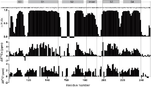 Figure 1-figure supplement 2. TALOS-N secondary structure analysis of backbone chemical shifts (top panel) and (bottom panels) deviations of the 13Cï¡ and carbonyl 13 Câ chemical shifts from random coil values. The chemical shift data for the KCNQ1 VSD been deposited in BioMagResBank (BMRB ID 30517). |