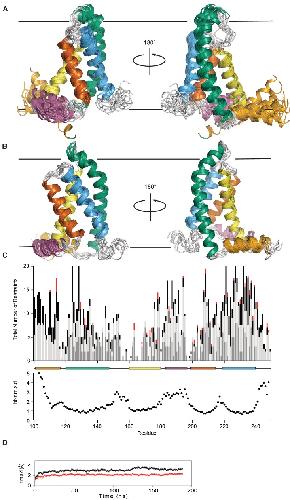 Figure 2-figure supplement 1. KCNQ1-VSD XplorNIH-determined structural ensemble, before and after molecular dynamics refinement. (A) The ensemble is comprised of the top 15 lowest energy structures out of 150 conformations generated by NMR data-restrained XplorNIH calculations (no bilayer). The transmembrane helices S1, S2, S3, and S4, are colored bluish green, yellow, vermillion, and sky blue respectively. The S2-S3 linker and S0 helices are colored orange and reddish purple. The loop between S1 (bluish green) and S2 (yellow) appears disordered due to lack of NMR-derived restraints. This does not necessarily mean this region does not adopt stable secondary structure. The approximate position of the membrane is indicated by a pair of grey lines. (B) The unrestrained molecular dynamics refined ensemble (MD carried out in an explicit hydrated DMPC bilayer) colored as in panel A (corresponding to PDB ID 6MIE containing 10 conformers). (C) The upper panel shows the total number of distance restraints per residue. For NOE-derived restraints that define a distance between two atoms in different residues, each residue receives a count of 0.5 per restraint. Long range, medium, and sequence distance restraints are colored red, black, and light grey respectively. For PRE-derived restraints, which define the distance between a given backbone amide and the MTSL free radical of the spin labeled residue, a count of 1.0 is added to the non-labeled residue. PRE-derived restraints are colored dark grey. The lower panel plots the backbone r.m.s.d. vs. residue number for the Xplor-NIH ensemble. The helical sections of secondary structure are indicated with colored boxes corresponding to the cartoon representation. (D) The backbone r.m.s.d. to seed starting coordinates of the transmembrane helices (red) and all residues (black) over the course of the unrestrained trajectory is shown. |