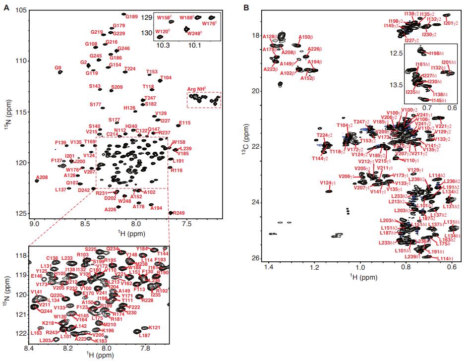 Figure 1. NMR spectra of the human KCNQ1 voltage-sensor domain. (A) 1H15 N TROSYHSQC spectrum recorded at 900 MHz of 2H,13C,15 N-Q1-VSD in LMPG micelles. Backbone amide peaks for 140 out of 147 non-proline residues (95%) have been assigned. Only a single set of peaks is observed. (B) 1H13 C HSQC methyl optimized spectrum recorded at 900 MHz of 13C,15 N-Q1-VSD in perdeuterated LMPG micelles. Methyl groups for 58 out of 68 (85%) residues were assigned (Ala 10 of10, Thr 6 of 8, Ile 9 of 11, Val 18 of 22, Leu 15 of 17). In addition to the presence of a very limited number of unassigned peaks from the VSD in this spectrum other unassigned peaks likely derive from natural abundance 13 C in residually protonated LMPG and also from the fully protonated buffer components TCEP and MES. The chemical shift assignments illustrated for panels A and B shift have been deposited in BioMagResBank (BMRB ID 30517). |