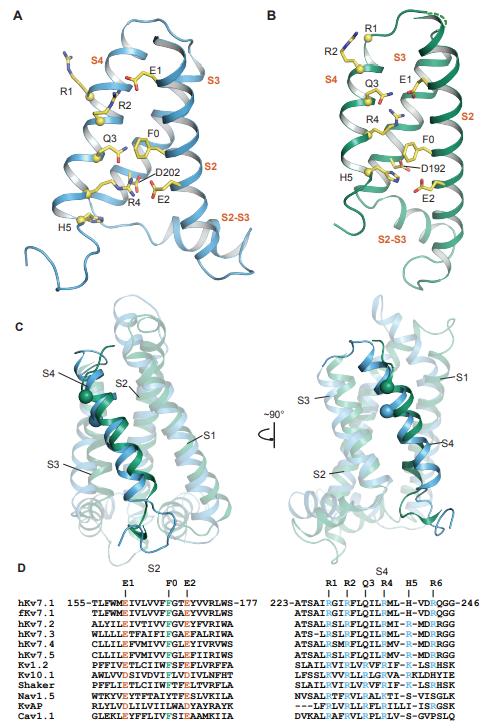 Figure 3. Comparison of intermediate and activated KCNQ1 VSD conformations. (A) Intermediate conformation of human KCNQ1 VSD (1st structure in the PDB 6MIE ensemble). (B Activated conformation of the Xenopus KCNQ1 VSD (PDB 5VMS)22. In both panels the Cï¡ atoms of the S4 polar residues are shown as yellow spheres and the transmembrane helices are labeled in vermillion text. S0 and S1 are not shown to improve clarity of side chain interactions. (C) Overlay of the NMR (sky blue) and cryoEM (bluish green) structures of the KCNQ1 VSD. All structural elements other than the S4 helix are semi-transparent. The Cα of the human residue G229 and the corresponding Xenopus residue G219 are shown as spheres. (D) Sequence alignments for S2 and S4 in the KCNQ/Kv7 family and select other voltage-gated ion channels. |