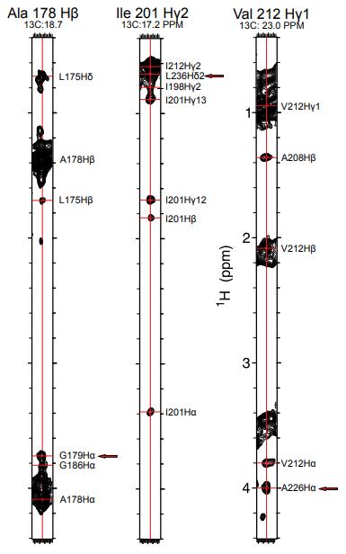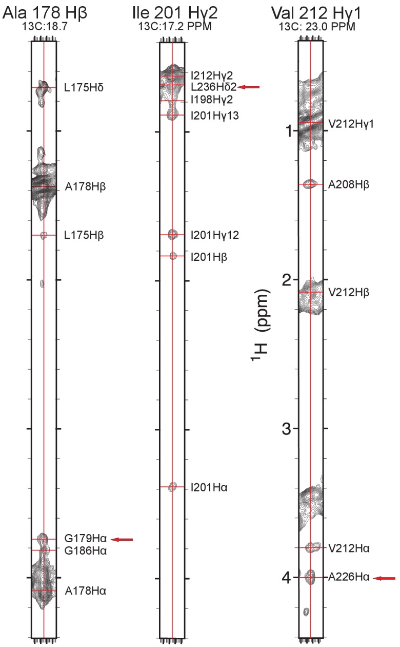 Figure 1-figure supplement 3. Examples of NOE measurements. Example strip plots showing long-range methyl-methyl and methyl-backbone Hα proton NOEs (red arrows) taken from the methyl-optimized 3D 13C-edited NOESY recorded on a 13C,15 N-labeled sample in deuterated LMPG. The chemical shift assignments illustrated in this figure have been deposited in BioMagResBank (BMRB ID 30517). |