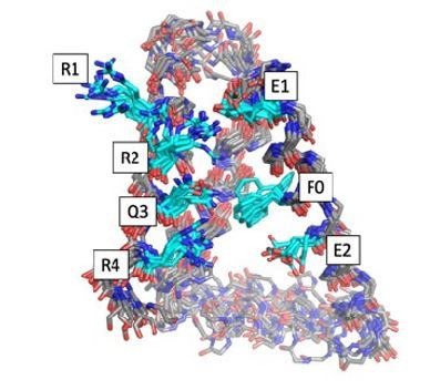Author response image 1. XplorNIH NMR ensemble prior to MD refinement displaying the orientation of the key sidechain residues.The S0 and S1 helices are not shown to improve clarity. |