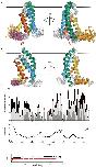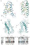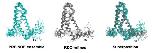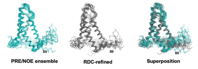 Author response image 2. XplorNIH ensemble before (left) and after (middle) RDC refinement.The RDC refined ensemble is colored gray and the NOE/PRE derived ensemble is colored teal. |
