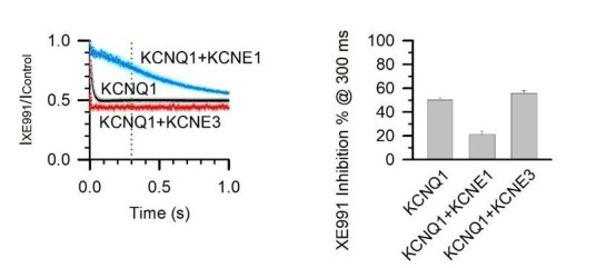 Author response image 3. 5 µM XE991 inhibition of KCNQ1, KCNQ1+KCNE1, and KCNQ1+KCNE3 channels at 300 ms activation duration.% inhibition was calculated with 1 â (IXE991 / IControl) at 300 ms after the test pulse started. |