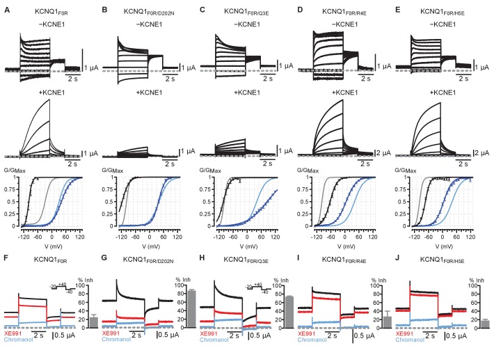 Figure 5-figure supplement 1. Electrophysiology results for KCNQ1 F0R single and double mutants with and without KCNE1 co-expression, and with XE991 exposure. F0 = F167; Q3 = Q234; R4 = R237; H5 = H240. Residue numbers correspond to human KCNQ1. All error bars are ±SEM. (A)Top: Current recordings of KCNQ1 F0R single mutant with and without KCNE1 co-expression. Bottom: Average GV relationships for KCNQ1 F0R (black, n = 3), KCNQ1 F0R + KCNE1 (dark blue, n = 5), KCNQ1 WT (gray), and KCNQ1 WT + KCNE1 (light blue). The single mutant KCNQ1 F0R exhibited dramatic left-shifted voltage-dependent activation compared to KCNQ1 WT, suggesting that the mutation destabilizes the resting state VSD. KCNE1 co-expression restored voltage-dependent activation to near WT levels and potentiated ionic current compared to the α-subunit alone, suggesting that KCNE1 partly rescues the ability of the single mutant F0R to gate normally. (B-E) Top: Current recordings of KCNQ1 F0R double mutants with and without KCNE1 co-expression. Bottom: Average GV relationships for the KCNQ1 double mutant α-subunit only (black), KCNQ1 double mutant + KCNE1 (dark blue), KCNQ1 F0R (grey), and KCNQ1 F0R + KCNE1 (light blue). All n > 3. (B) F0R/D202N featured a further left-shifted voltage-dependent activation compared to F0R single mutant. KCNE1 co-expression greatly suppressed F0R/D202N current, suggesting that F0R/D202N favored the intermediate VSD state and IO channel state. (C) F0R/Q3E demonstrated current suppression upon KCNE1 co-expression when compared to α-subunit alone, suggesting that F0R/Q3E favored the intermediate VSD state and the IO channel state. Furthermore, the conductance-voltage (G-V) curve for the mutant KCNQ1 co-expressed with KCNE1 tracks the development of the AO state because KCNE1 suppresses IO-state current. F0R/Q3E+KCNE1 featured a right-shifted voltage-dependent activation compared to F0R single mutant, consistent with the mutant favoring the intermediate VSD state and resisting transition into the AO state. (D-E) F0R/R4E and F0R/H5E double mutants exhibited an opposite phenotype compared to F0R/Q3E. Upon KCNE1 co-expression, ionic currents for F0R/R4E and F0R/H5E were potentiated, and voltage-dependent activation was left-shifted compared to the F0R single mutant. Together, these results suggest F0R/R4E and F0R/H5E favored the activated VSD state and the AO state. Overall, F0R/Q3E and F0R/D202N double mutants demonstrated phenotypes consistent with the mutants favoring the IO channel state; while F0R/R4E and F0R/H5E exhibited distinct and opposite phenotypes, suggesting that the latter mutants promote the AO channel state. However, the presence of voltage-dependence in these mutants represents a confounding factor, as the VSD retain voltage sensitivity. By adding the S3 D202N mutation into the F0R/Q3E and F0R/H5E mutants, this voltage-dependence was abolished (Main Figure 5), suggesting that the triple mutants highly stabilize the VSD states and that the charge transfer residue S3 D202 plays a role in maintaining the voltage-dependence of the mutants F0R/Q3E and F0R/H5E. Importantly, F0R/Q3E/D202N and F0R/H5E/D202N demonstrated qualitatively identical phenotypes compared to F0R/Q3E and F0R/H5E (Main Figure 5), but without the confounding factor of voltage-dependence. (F-J) Steady-state current recordings of KCNQ1 mutants in control ND96 solution (black), 5 μM XE991 solution (red), and 150 μM chromanol 293B solution (blue). Note that the holding potential was -20 mV as shown by the inset voltage protocols. The -20 mV holding potential yielded non-zero currents before the test pulse because the mutants were constitutively opened. Bar plots show average chromanol-sensitive current inhibition (see Methods). All n > 3. Mutants F0R/D202N and F0R/Q3E demonstrated robust and characteristic IO-current inhibition by 5 μM XE991, consistent with the idea that F0R/D202N and F0R/Q3E favor the IO state. In contrast, mutants F0R, F0R/R4E, and F0R/H5E featured the characteristic AO-current insensitivity to 5 μM XE991, consistent with the hypothesis that these mutations promote the AO state. Critically, XE991 data provided consistent categorization of the F0R single and double mutants when compared to KCNE1 co-expression data (panels A-E), lending further support to the conclusion that these mutants can be classified as promoting the IO state (F0R/D202N, F0R/Q3E) or the AO state (F0R/R4E, F0R/H5E). |