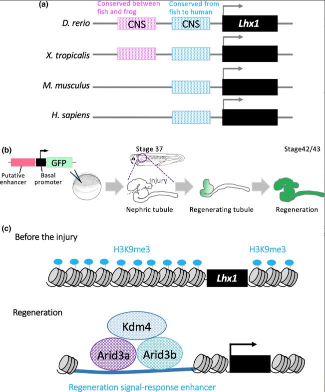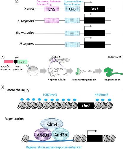 Figure 3. (a) Extraction of candidate enhancers for Lhx1 using evolutionarily conserved noncoding sequences; the magenta box indicates the noncoding evolutionarily conserved sequence (CNS) between frogs and fish. The blue box indicates the CNS among vertebrates. (b) Identification of regenerationârelated enhancers for frog nephric tubules; nonmosaic founder frogs are generated by injecting reporter DNA and sperm nuclei into unfertilized eggs. Functional enhancers in regenerating tissues can be identified using founder transgenic animals. (c) Mechanisms of activation of regeneration signalâresponse enhancers (RSREs); with the H3K9me3 demethylaseâKdm4 complex, Arid3a binds to RSREs and reduces H3K9me3 levels, thereby promoting the expression of Lhx1 during regeneration of nephric tubules |