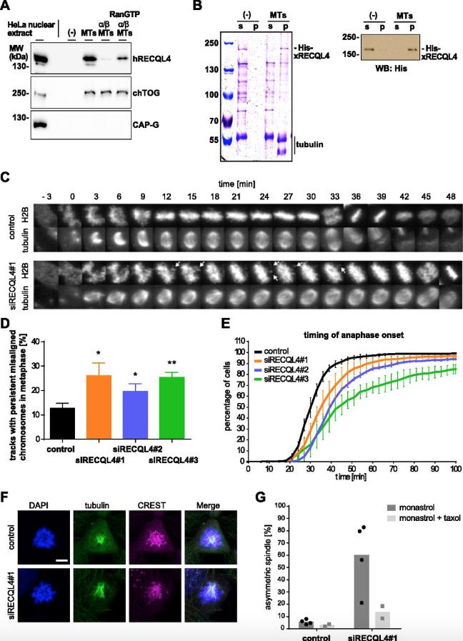 Figure 1. RECQL4 is a MAP with a spindle function. (A) Human RECQL4 binds to microtubules (MTs) in a RanGTP-regulated manner. HeLa nuclear extract (1 mg/ml) was incubated with 2 μM pure taxol-stabilized MTs, in the presence or absence of recombinant importin α/β complex and RanGTP, and pelleted. MAPs were eluted with high salt from the pellet, and the supernatant after a second centrifugation was analyzed by immunoblot. (B) RECQL4 directly binds to MTs. 0.1 μM recombinant RECQL4 was incubated in the absence or presence of 2 μM taxol-stabilized MTs. Samples were separated by centrifugation and the supernatant (s) and pellet (p) fractions were analyzed by Coomassie staining and Western blot (WB) against His6-tag. (C) HeLa cells, stably expressing mCherry-H2B and EGFP-α-tubulin, were imaged for 48 h starting at 24 h post-transfection in intervals of 3 min. A representative track through mitosis is shown from control transfected and RECQL4âdown-regulated cells. White arrows show misaligned chromosomes. (D) Quantification of chromosome misalignment in metaphase. Persistent misaligned chromosomes, as shown in (C), were quantitated in more than 100 cell tracks per siRNA in each of the three independent experiments. Error bars: SD. **P < 0.01; *P < 0.05 (t test, two-tailed). (E) RECQL4 down-regulation slows down mitotic progression. Timing from prophase (0 min) to anaphase onset based on chromatin morphology is shown for the cells treated with control and three different RECQL4 siRNAs. Using data from more than 100 mitotic cell tracks per experiment, three independent experiments are plotted. Error bars: SD. (F) Representative immunofluorescence images from HeLa cells transfected for 72 h with RECQL4 siRNA showing asymmetric monopolar spindles, or control siRNA showing symmetric monopolar spindles. Cells were incubated with 70 μM of the kinesin-5/Eg5 inhibitor monastrol, fixed, and stained with DAPI (blue) and antibodies against α-tubulin (green) and human centromere (CREST, magenta). Scale bar 5 μm. (G) Quantitation shows the percentage of asymmetric monopolar spindles after monastrol treatment in the absence (four independent experiments) or presence of taxol (two independent experiments). More than 22 cells with monopolar spindles were evaluated per data points. Black dots and grey squares indicate the mean of each independent experiment. *P < 0.05 (t test, two-tailed). |
