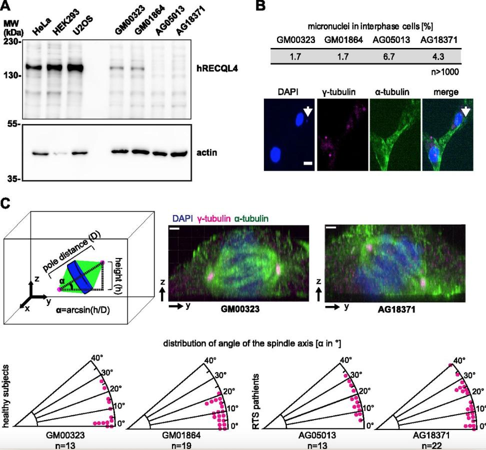 Figure 2. Fibroblasts from RothmundâThomson syndrome patients have abnormal spindle axis and more micronuclei. (A) Expression of RECQL4 in HeLa, HEK293T, and U2OS immortalized cell lines is compared with the expression in healthy (GM00323, GM01864) and RothmundâThomson syndrome patient (AG05013, AG18371) fibroblasts, using human RECQL4 antibody. (B) RothmundâThomson syndrome fibroblasts (AG05013, AG18371) show increased amount of micronuclei as compared with healthy fibroblasts (GM00323, GM01864). More than 1,000 interphase cells per cell line were analyzed for the presence of micronuclei (DAPI stained dots) in the cytoplasm, which was identified by the α-tubulin staining. The pictures show a RothmundâThomson syndrome fibroblast (AG05013) with a micronucleus (arrow). Scale bars: 5 μm. (C) Fibroblasts were stained with α-tubulin (green) and γ-tubulin (magenta) antibodies and chromatin with DAPI (blue). The tilting of the spindle axis with respect to the culture plate was quantitated based on γ-tubulin staining (centrosomes) as in the scheme. The pictures show examples of spindle axis lateral views from a healthy (GM00323) or RothmundâThomson syndrome (AG18371) fibroblast. The plot shows the angle of the mitotic spindle axis with respect to the culture plate. The difference between the two control fibroblast cell lines GM00323 and GM01864 and one patient cell line (AG05013) has P values of 0.02 and 0.01, respectively, the P values of the control and the second patient cell line (AG18371) are 0.06 each. Scale bars: 1.5 μm. |