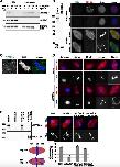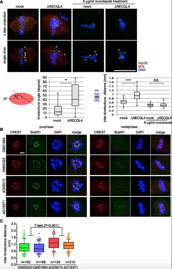 Figure 6. RECQL4 depletion or malfunction increases inter-kinetochore distance. (A) Cycled spindles are assembled as in Fig 3C and D and incubated for an additional 10 min with or without 6 μg/ml nocodazole. Samples were fixed, spun down on coverslips, stained for a kinetochore marker Ndc80 and DAPI, and analyzed by confocal microscopy. Maximum intensity projections are shown in the upper row. Single confocal slices (lower row) were used to detect kinetochore pairs (arrow heads) for further analysis. Quantitation shows the inter-kinetochore distance (right) and the relative angles of sister kinetochore pairs (left), measured with respect to the spindle pole to pole axis. n > 30 kinetochore pairs from > 6 structures. Note that after RECQL4 depletion, sister kinetochore pairs do not align to the pole to pole axis. Scale bar, 20 μm. ****P < 0.0001; **P < 0.01; NS (not significant) P > 0.05 (t test, two-tailed). (B) Immunofluorescence staining of control (GM00323, GM01864) and RothmundâThomson syndrome patient (AG05013, AG18371) fibroblasts with the kinetochore marker CREST and checkpoint marker BubR1. Scale bar, 5 μm. (C) Inter-kinetochore distance was measured in metaphase cells of control (GM00323, GM01864) and RothmundâThomson syndrome patient (AG05013, AG18371) fibroblasts based on CREST signals for the kinetochore pairs attached to microtubules (identified by the absence of the BubR1 signal) after 3D reconstruction. (n) indicates the number of kinetochore pairs measured per fibroblast line. P < 0.001 (t test, two-tailed). |