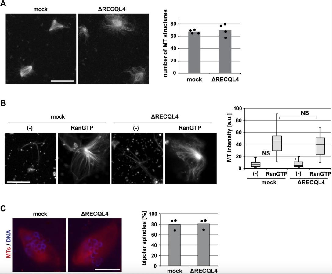 Figure S4. RECQL4 is not required for spindle microtubule assembly. (A) Ran-induced microtubule (MT) assembly in CSF extract. Mock or RECQL4-depleted CSF extract was incubated with RanQ69L-GTP in the presence of Cy3-labled tubulin. After spindle assembly, samples were fixed, spun down on coverslips, and analyzed by confocal microscopy. The number of MT structures was counted in 100 randomly selected fields with a 63à objective. Columns show the average of four independent experiments and circles indicate individual data points. Scale bar, 10 μm. (B) Centrosomal asters were assembled in mock or RECQL4-depleted CSF extract in the presence of Cy3-labled tubulin and purified centrosomes in the presence or absence of RanQ69L-GTP. Samples were fixed, spun down on coverslips, and analyzed by confocal microscopy. MT intensity was quantified. n > 20 structures. NS (not significant) P > 0.05 (t test, two-tailed). (C) DNA-bead spindles were assembled around DNA-coated beads in cycled extract supplemented with Cy3-labled tubulin. After assembly, samples were fixed, stained with DAPI, and analyzed by confocal microscopy. Frequency of bipolar spindles was determined on more than 50 DNA bead clusters, containing 15â40 beads, per experiment and condition. Columns show the average of three independent experiments and circles indicate individual data points. Scale bars, 20 μm. |