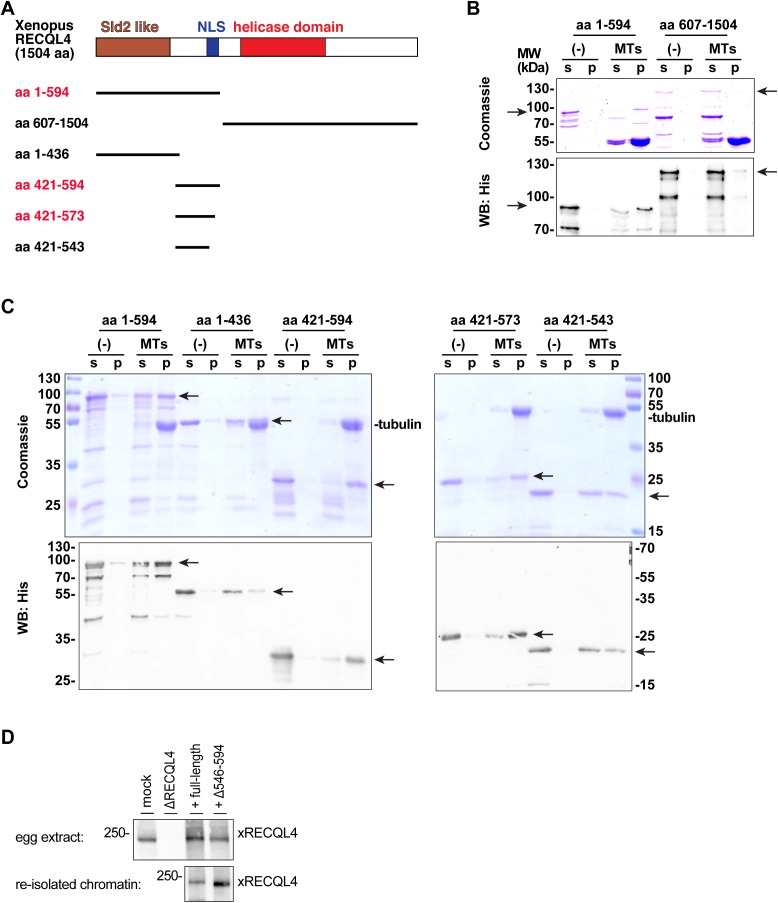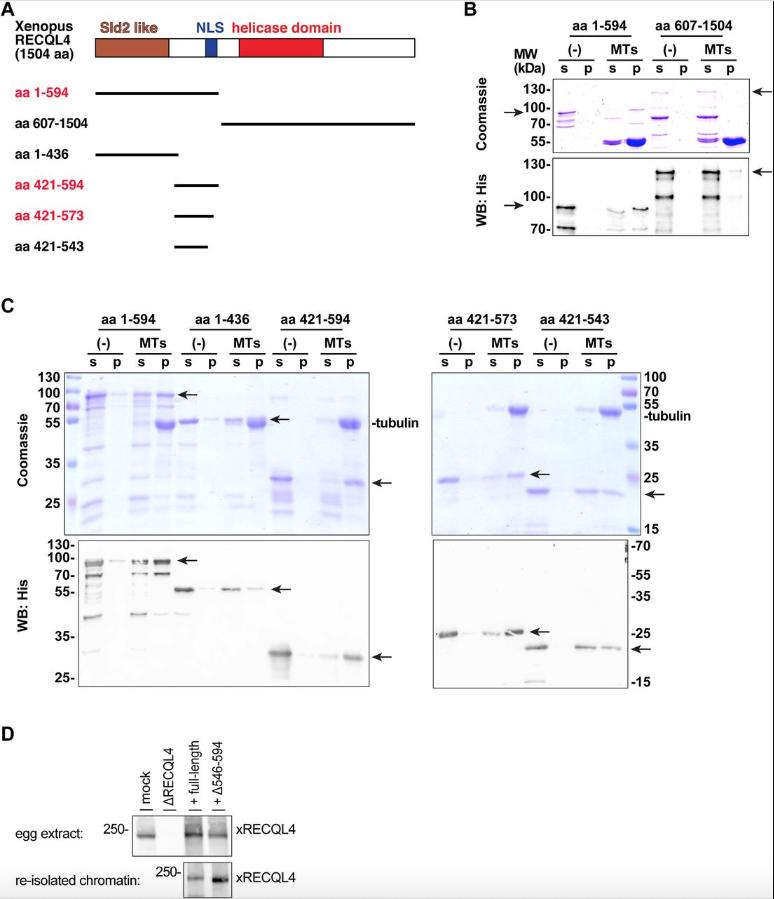 Figure S5. The NLS region of RECQL4 binds to microtubules. (A) Xenopus RECQL4 domain structures, and recombinant fragments expressed and purified. The proteins labeled in red bound strongly to microtubules (MTs), as shown in (B) and (C). (B) The N-terminal (aa 1â594) and C-terminal (aa 607â1,504) fragments of Xenopus RECQL4 were incubated in the absence or presence of MTs. After centrifugation, the supernatant (s) and pellet (p) were analyzed by Coomassie staining or Western blot (WB) against His6-tag. The respective fragments are indicated by arrows. (C) Different RECQL4 fragments in the N-terminal part of the protein were analyzed for MT interaction as in a (B). (D) Sperm chromatin was incubated with interphase RECQL4-depleted extract supplemented with mRNA encoding wild-type REQL4 or the deletion mutant (Î546â594). Chromatin was re-isolated by centrifugation and analyzed by immunoblotting (lower panel). To check for efficient translation of the added mRNA, control (mock), RECQL4-depleted (ÎRECQL4) extracts, and RECQL4-depleted supplemented with mRNAs are analyzed in the top panel. |