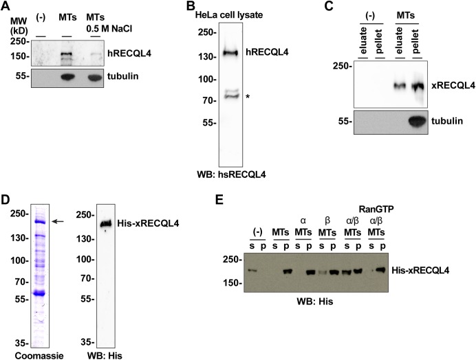 Figure S1. RECQL4 is a RanGTP dependent MAP. (A) Endogenous human RECQL4 binds to microtubules (MTs) in a salt-sensitive manner. HeLa nuclear extract was incubated in the presence or absence of taxol-stabilized MTs and 0.5 M NaCl and centrifuged. MT pellets were immunoblotted using human RECQL4 and α-tubulin antibodies. (B) Preparation of human RECQL4 antibody. Recombinant human RECQL4 aa 1â831 was expressed in bacteria, purified, and used for antibody production in rabbits. The generated antibody detected endogenous hRECQL4 in HeLa cell lysate. *, nonspecific band. (C) Endogenous Xenopus RECQL4 binds to MTs. Xenopus CSF egg extract was incubated with taxol-stabilized MTs. MTs and MAPs were spun down. MAPs are eluted from MTs with high salt and separated by centrifugation. The eluate and MT pellet were immunoblotted. (D) Recombinant Xenopus RECQL4 expressed in insect cells and purified with TALON beads. Coomassie staining and Western blot (WB) using an anti-His 6-antibody are shown. (E) Xenopus RECQL4 binds to MTs in a RanGTP-regulated manner. Recombinant RECQL4 was incubated with MTs as in Fig 1B, but, where indicated, in the presence of recombinant importin α, importin β, and/or RanQ69L mutant loaded with GTP (RanGTP). After centrifugation, supernatant (s) and pellet (p) were analyzed by Western blot. |