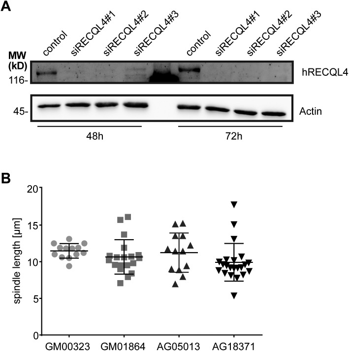 Figure S2. Downregulation of RECQL4 in HeLa cells. (A) HeLa cells stably expressing histone H2B-mCherry and EGFP-α-tubulin were transfected with siRNA oligonucleotides used in Fig 1. Western blot using human RECQL4 antibody shows the depletion efficiency of the siRNA oligos 48 h and 72 h after transfection. (B) The spindle length in metaphase is similar in RothmundâThomson syndrome fibroblasts (AG05013, AG18371) and healthy fibroblasts (GM00323, GM01864). The spindle pole to pole distance was quantified based on γ-tubulin signals (see Fig 2B). |