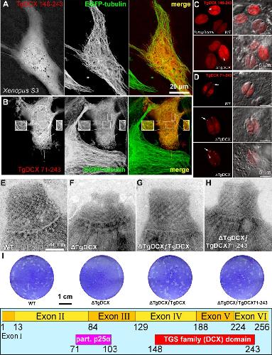 Fig. 6. The DCX domain alone does not support stable microtubule binding in Xenopus cells, or conoid targeting in Toxoplasma. a-b Deconvolved wide-field images of Xenopus S3 cells expressing EGFP-tubulin (green) and either mCherryFP-TgDCX148â243 (a, red) or mCherryFP-TgDCX71â243 (b, red). The boxed insets in b are 1.5x enlarged and contrast-enhanced views of small regions over the nucleus that include the slices from the 3D stacks in which these individual arcs are clearly seen (also see Additional file 5: Movie S3). The DCX domain alone (TgDCX148â243) is not sufficient for microtubule binding, but P25αâ+âDCX domain together (TgDCX71â243) cause binding to microtubules and generation of short arcs. c-d Deconvolved wide-field images of the parental RHÎku80Îhx (âWTâ) and TgDCX knockout (âÎTgDCXâ) parasites expressing either mCherryFP-TgDCX148â243 (c), or mCherryFP-TgDCX71â243 (d), two examples are shown for ÎTgDCX). Arrowheads in c indicate the nucleus. Arrows in d point to the conoid; arrowhead in d points to a daughter conoid. e-h EM images of the conoid region of negatively stained T. gondii. Parental RHÎku80Îhx (e, âWTâ); TgDCX knockout (f, âÎTgDCXâ); knockout parasites transfected with a plasmid expressing either EGFP tagged full-length TgDCX (g, âÎTgDCX/TgDCXâ), or mCherryFP-TgDCX71â243 (h, âÎTgDCX/TgDCX71â243â), both expressed under control of the T. gondii α-tubulin promoter (constitutive, See Fig. 9d). i Plaque assays (see Methods) of the parasite strains used for e-h; the parental T. gondii, TgDCX-knockout parasites, and knockout parasites complemented with full-length TgDCX or the fragment containing only the partial P25α domain and the DCX domain, TgDCX71â243. Annotations are the same as e-h. j Domain structure of TgDCX in which the amino acid boundaries of the partial P25α domain and the DCX domain are numbered |