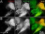 Fig. 4. Curved fibers coated with mCherryFP-TgDCX are stable. Deconvolved wide-field images of Xenopus S3 cells expressing EGFP-α-tubulin (green) and mCherryFP-TgDCX (red) before (a) and after (b) treatment with 16 μM nocodazole for 65 min. Note that the curved fibers coated with mCherryFP-TgDCX are resistant to depolymerization by nocodazole. Arrows indicate untransfected cells, expressing EGFP-α-tubulin only, in which virtually all microtubules have depolymerized |