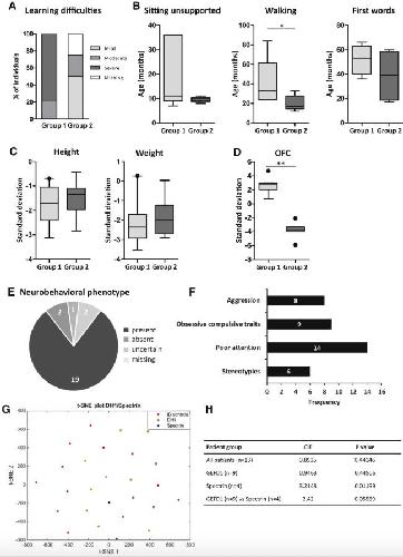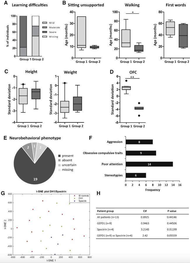 Figure 2. Individuals Harboring Variants in Either GEFD1 or Spectrin Domains Show Distinct Neurodevelopmental Phenotypes(A) Percentage of affected individuals with different levels of learning difficulties in either spectrin domain (group 1) or GEFD1 (group 2) mutation cases. 75% of group 2 individuals have mild-moderate learning difficulties. 78% of group 1 individuals have severe learning difficulties.(B) Early developmental milestones (sitting unsupported, walking, and first words) are delayed in both group 1 and group 2 individuals, but group 1 individuals are affected more severely. For statistical analysis, refer to Table S3. Walking: ∗p = 0.035.(C) Height and weight standard deviations from mean in either group 1 or group 2 individuals. The median height for group 1 individuals with spectrin mutations was −1.69 SD, and for group 2 individuals with GEFD1 mutations it was −1.34 SD. 33% of the individuals in group 1 and 14% of individuals in group 2 had a height SD of greater than −2 SD, which is often considered as short stature. Weight SD was also reduced in both groups.(D) Microcephaly was seen in 100% of group 2 individuals, who had a mean OFC of −3.82 SD (median OFC of −3.8 SD). Individuals within group 1 present with macrocephaly. 78% had an OFC greater than 2 SD from the mean; mean OFC was +2.6 SD, median OFC was + 2.7 SD, and OFC range was between +0.7 SD and +4.7 SD. ∗∗p < 0.001 (Table S3)(E) A neurobehavioral phenotype was observed in 19 out of the 24 (79%) individuals described in this study.(F) Recurrent behavioral features include stereotypies (6/24 patients), poor attention (14/24 individuals), obsessive-compulsive traits (9/24 individuals), and aggression (8/24 individuals). In total, 2/24 were identified as social or friendly.(G and H) Quantitative facial phenotyping. t-distributed stochastic neighbor embedding (t-SNE) plot of the vectors of individuals with alterations in GEFD1 and the seventh spectrin domain and the matched controls with intellectual disability. The statistically significant clustering of individuals with mutations in the spectrin domain indicates a recognizable facial phenotype. |