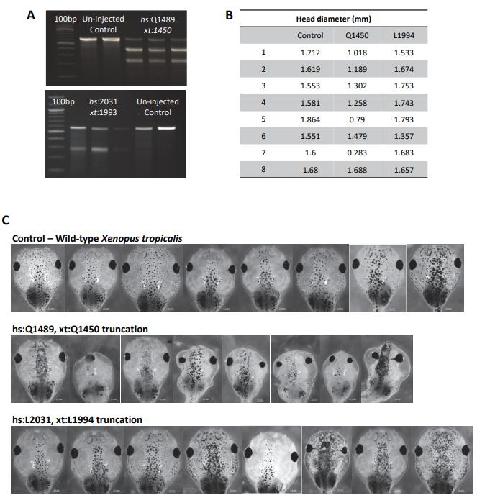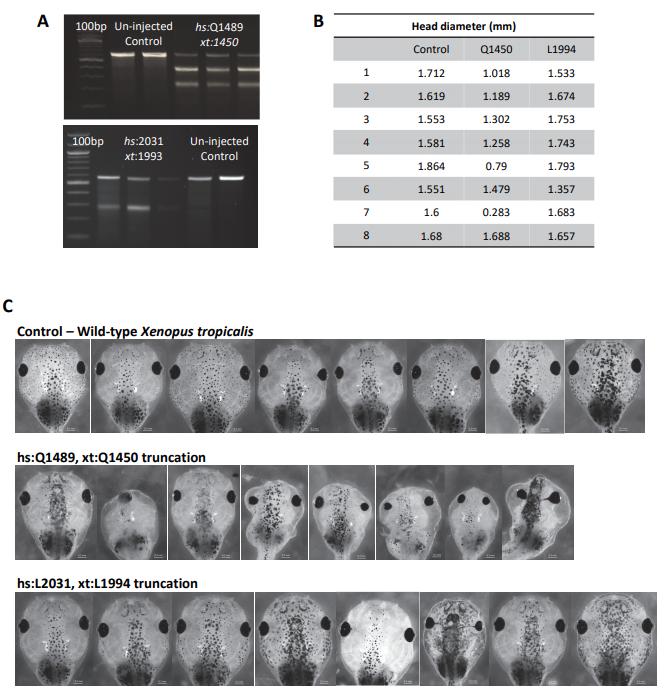 Figure S3: Truncation in the GEFD1 domain reduces head size in X.tropicalis. A. Amplification of the target region followed by T7 endonuclease assay and Sanger sequencing confirmed that indels had been made at the target sites creating the truncations shown. B. Measurement of the head diameter of the injected tadpoles, 8 individuals per condition. C. Micrographs of all tadpoles used in the experiment |