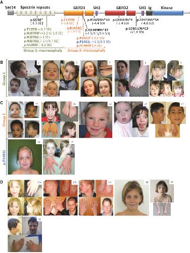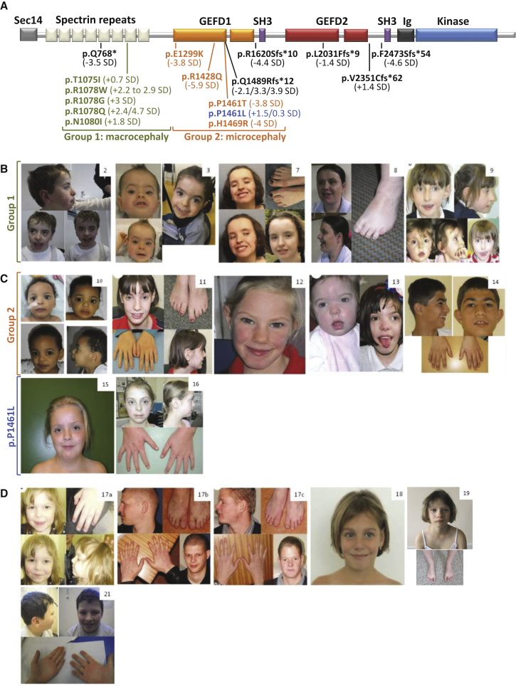 Figure 1. Pathogenic TRIO Variants Found in Individuals with Neurodevelopmental Disorders(A) Schematic representation of TRIO domains with annotated missense and nonsense mutations identified in affected individuals. Patient groups 1 and 2 are highlighted in green and orange, respectively. Missense mutation p.Pro1461Leu is in blue so that it is differentiated from the other GEFD1 mutants (see text for details). Nonsense variants are written in black. The numbers in brackets correspond to the OFC of each affected individual (+/−SD).(B) Clinical photographs of individuals carrying an alteration in the seventh spectrin repeat domain of TRIO (group 1). Individuals 2 and 3 have the p.Arg1078Trp variant, individuals 7 and 8 have the p.Arg1078Gln variant, and individual 9 has the p.Asn1080Ile variant.17(C) Clinical photographs of individuals carrying an alteration in the GEFD1 of TRIO (group 2 and the p.Pro1461Leu variant). Individuals 10–16 harbor the following variants: (10) p.Glu1299Lys, (11 and 12) p.Arg1428Gln, (13) p.Pro1461Thr,17 (14) p.His1469Arg, (15 and 16) p.Pro1461Leu.(D) Clinical photographs of individuals carrying nonsense mutations: individuals 17a–17c all carry the p.Gln1489Argfs∗12 variant and are related;17 patient 17a is the daughter of individual 17b. Individuals 17b and 17c are brothers. Individuals 18, 19, and 21 carry the nonsense variants p.Gln768∗, p.Arg1620Serfs∗10, and p.Val2351Cysfs∗62, respectively. |