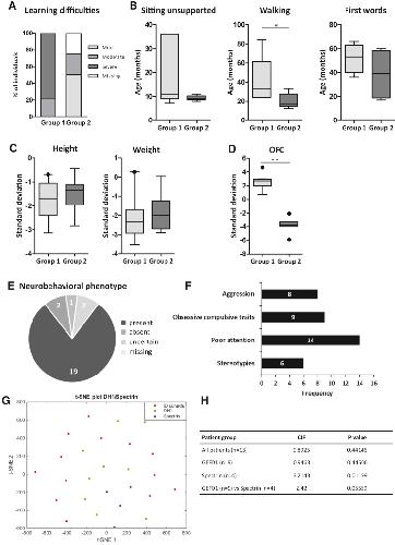 Figure 2. Individuals Harboring Variants in Either GEFD1 or Spectrin Domains Show Distinct Neurodevelopmental Phenotypes (A) Percentage of affected individuals with different levels of learning difficulties in either spectrin domain (group 1) or GEFD1 (group 2) mutation cases. 75% of group 2 individuals have mild-moderate learning difficulties. 78% of group 1 individuals have severe learning difficulties. (B) Early developmental milestones (sitting unsupported, walking, and first words) are delayed in both group 1 and group 2 individuals, but group 1 individuals are affected more severely. For statistical analysis, refer to Table S3. Walking: ∗p = 0.035. (C) Height and weight standard deviations from mean in either group 1 or group 2 individuals. The median height for group 1 individuals with spectrin mutations was −1.69 SD, and for group 2 individuals with GEFD1 mutations it was −1.34 SD. 33% of the individuals in group 1 and 14% of individuals in group 2 had a height SD of greater than −2 SD, which is often considered as short stature. Weight SD was also reduced in both groups. (D) Microcephaly was seen in 100% of group 2 individuals, who had a mean OFC of −3.82 SD (median OFC of −3.8 SD). Individuals within group 1 present with macrocephaly. 78% had an OFC greater than 2 SD from the mean; mean OFC was +2.6 SD, median OFC was + 2.7 SD, and OFC range was between +0.7 SD and +4.7 SD. ∗∗p < 0.001 (Table S3) (E) A neurobehavioral phenotype was observed in 19 out of the 24 (79%) individuals described in this study. (F) Recurrent behavioral features include stereotypies (6/24 patients), poor attention (14/24 individuals), obsessive-compulsive traits (9/24 individuals), and aggression (8/24 individuals). In total, 2/24 were identified as social or friendly. (G and H) Quantitative facial phenotyping. t-distributed stochastic neighbor embedding (t-SNE) plot of the vectors of individuals with alterations in GEFD1 and the seventh spectrin domain and the matched controls with intellectual disability. The statistically significant clustering of individuals with mutations in the spectrin domain indicates a recognizable facial phenotype. |