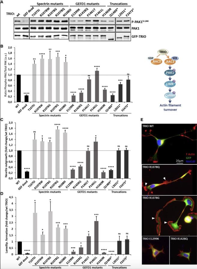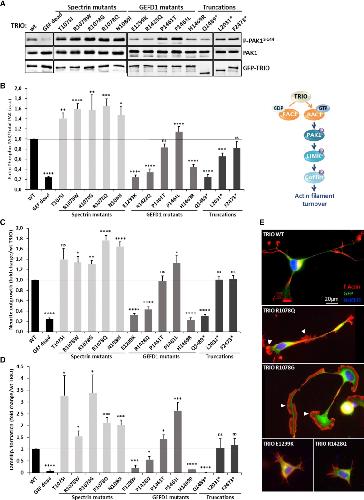 Figure 4. The Spectrin Mutants of TRIO Enhance RAC1 Signaling, Neurite Outgrowth, and Lamellipodia Formation in N1E-115 Cells, Whereas the GEFD1 Mutants Are Mostly Impaired in These Processes(A) Immunoblot analysis of HEK293T cell lysates transfected with the indicated GFP-TRIO variants and detected with an anti-GFP antibody (lower panel). PAK1 phosphorylation amounts are detected with a phospho-Ser144 PAK1 antibody (upper panel) and compared to total PAK1 amounts detected with a PAK1 antibody (middle panel).(B) Quantification of the ratio of phospho-PAK1 amounts over total PAK1 expression. PAK1 phosphorylation is used as a readout for the activation of the RAC1 signaling cascade. Data are presented as the mean ± SEM of at least five independent experiments.(C) Quantification of the neurite outgrowth induced by WT or mutant TRIO. Neurite outgrowth is monitored on the basis of the number of cells harboring an extension of at least twice the length of the soma. Data are presented as n-fold change over WT TRIO, which was arbitrarily set to 1. Data are presented as the mean ± SEM of at least five independent experiments.(D) Quantification of lamellipodia formation induced by WT or mutant TRIO. Data are presented as n-fold change over WT TRIO, which was arbitrarily set to 1. Data are presented as the mean ± SEM of at least five independent experiments.Statistical analysis in (B), (C), and (D) were made by one-way ANOVA followed by Dunnettâs test. Asterisks indicate datasets significantly different from WT (âp < 0.05, ââp < 0.01, âââp < 0.001, and ââââp < 0.0001).(E) Micrographs of N1E-115 cells transfected with the indicated GFP-TRIO variants (green); rhodamine-phalloidin and Hoechst stained the actin (red) and nuclei (blue), respectively. Representative images for each variant type are presented. White arrowheads point to lamellipodia. Scale bar: 20 μm. |
