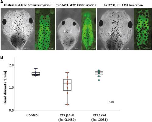 Figure 5. Truncation in the TRIO GEFD1 Reduces Head Size in X. tropicalis (A) X. tropicalis eggs from a single female for each of two biological replicates (with parents from different genetic backgrounds) were fertilized with frozen sperm and injected at the one-cell stage with CRISPR-Cas targeting the genome as shown. Representative micrographs for each condition are shown (black and white photos) (all tadpoles are shown in Figure S3). Performing the GEFD1 and GEFD2 frameshift in a tubb2B.GFP X. tropicalis showed that forebrain deformities had occurred in 6/8 GEFD1 truncation tadpoles, which was not the case for GEFD2 frameshift. Representative micrographs for each condition are shown (color photos) (all tadpoles are shown in Figure S4). (B) Comparing the head diameter of the tadpoles carrying truncations in the GEFD1 (hs: Gln 1489â = xt Gln 1450) and GEFD2 (hs: Leu 2031â = xt Leu 1994) domains showed that GEFD1 truncations caused microcephaly, whereas GEFD2 truncations had no effect. Quantification is shown for eight individuals measured (all tadpoles are shown in Figure S3). |