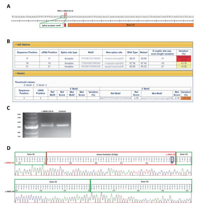 Figure S1: Impact of splice acceptor site variant in TRIO (c.4860-2A>G) on aberrant splicing. A. c.4860-2A>G is located in splice acceptor motif site of Exon 33. B. Human Splice Site Finder (HSF Version 3.1) and MaxEntScan predicted splice acceptor site broken. C. Gel electrophoresis shows an extra band in c.4860-2A>G PCR. D. Sanger sequencing shows an extra 51 nucleotides between Exon 32 and Exon 33. |