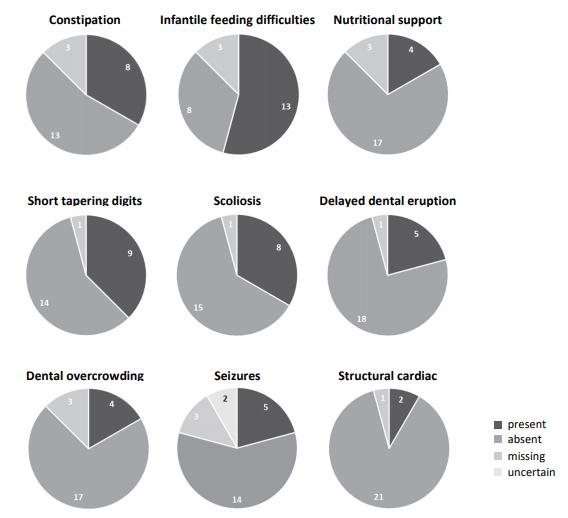 Figure S2: Expanded phenotype characteristics across the cohort. Gastrointestinal features including infantile feeding difficulties and constipation where frequently observed. Skeletal manifestations included short tapering digits, scoliosis and delayed dental eruption were also noted. Classified as: present, dark grey; absent, middle grey; missing, light grey and uncertain, very light grey. |