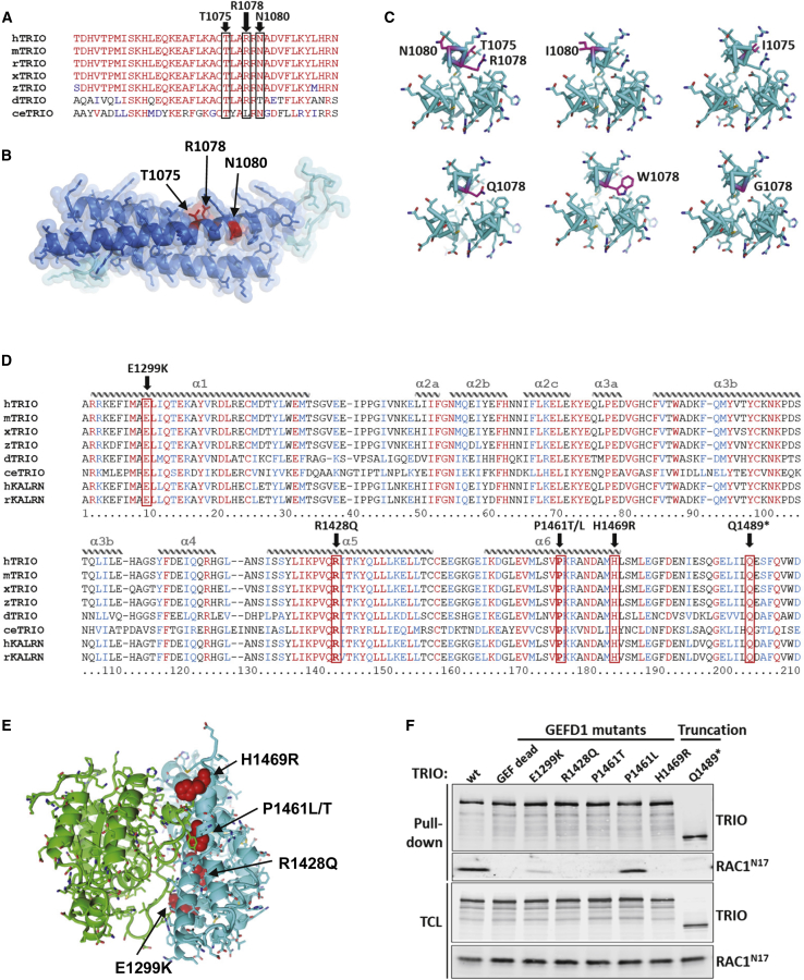 Figure 3. Mapping of the Mutation Sites on the 3D Structure of the TRIO Spectrin 7 Repeat Domain and GEFD1 (A) Species conservation of the residues in TRIOâs seventh spectrin repeat, which is mutated in neurodevelopmental diseases. Identical residues are labeled in red, and similar residues are in blue. The positions of the residues p.Thr1075, p.Arg1078, and p.Asn1080 are boxed in black and indicated on top of the sequence, which encompasses amino acids 1053 to 1091, corresponding to the second α helix of the spectrin repeat. Represented species are Homo sapiens (h), Mus musculus (m), Rattus norvegicus (r), Xenopus laevis (x), Danio rerio (z), Drosophila melanogaster (d), and Caenorhabditis elegans (ce). (B) Lateral view of the structural model of the seventh spectrin repeat of TRIO. The spectrin domain was modeled based on the crystal structures of human beta2-spectrin (PDB ID 3EDV30) with our sequence alignment and SWISS-MODEL server.32 Parts of the structure that were modeled with high and low confidence are in blue and cyan, respectively. Mutations within the spectrin domain seen in affected individuals are indicated in red. (C) Axial view of the cross section of the structure at the site of the mutations. Mutations are indicated in magenta. (D) Sequence alignment of the RAC1-specific DH1 domain of TRIO (and KALIRIN) across evolution. Identical residues are labeled in red and similar residues are labeled in blue. The α helices are depicted schematically on top of the sequence alignment. The positions of the alterations p.Glu1299Lys, p.Arg1428Gln, p.Pro1461Leu, p.Pro1461Thr, and p.His1469Arg are indicated in bold and boxed in red. Each mutation affects a highly conserved residue within helices α-1, α-5, and α-6, which make contact with the target GTPase RAC1. Represented species are Homo sapiens (h), Mus musculus (m), Rattus norvegicus (r), Xenopus laevis (x), Danio rerio (z), Drosophila melanogaster (d), and Caenorhabditis elegans (ce). (E) Structure of the DH1 domain of TRIO (cyan) in complex with the small GTPase substrate RAC1 (green). Mutations within the DH1 domain seen in affected individuals are indicated in red and can be seen to occur at the protein-substrate interface. The complex was modeled with the crystal structures of DH1 (PDB: 1NTY) and the complex with substrate (PDB: 1KZ7). Figures of the protein structures were generated with PyMol.33 (F) Most of the GEFD1 mutants are affected in their ability to bind to RAC1N17 (DN). Immunoblot analysis of a Streptavidin pulldown assay of biotinylated TRIO variants. HEK293T cells were transfected with the indicated biotinylated GFP-TRIO variants and RAC1N17. TRIO was pulled down with Streptavidin beads, and the co-precipitating RAC1N17 was detected with a RAC1 antibody. |