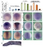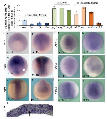 Figure 2: mcl1 expression pattern suggests a role for this protein in axial organizer development. (A) RT-qPCR analysis of apoptotic cascade mRNA in Xenopus early neurula. Analysis performed on RNA extracted from dissected neural plates, and ventral ectoderms (N=15) of X. laevis embryos at stage (st.) 14 for pro-apoptotic factors â bak, bad, bid, bim, including caspases (casp) - casp3, casp7, and casp9 and anti-apoptotic factors â bcl2l10, mcl1, bcl-xl, and bcl2l2. Expression is normalized relative to ef1α. Relative normalized expression is indicated as means ± s.e. (B) mcl1 expression pattern. ISH using a probe for mcl1 from stage 11 to stage 20 embryos; (a) ventral view, dorsal up, (b-e) dorsal view anterior up, (f) anterior view dorsal up. (g) Transverse section of (c) in the posterior part of the embryo. The scale bar stands for 200μm. The white arrow indicates the border between the ectoderm and the neuroectoderm. The black arrow indicates the notochord. (C) bcl-xl expression pattern in X. laevis gastrula and neurula. ISH using a probe for the anti-apoptotic gene bcl-xl from stage 12 to stage 20. Embryos are shown dorsal side up. |