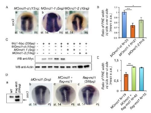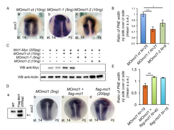 Figure 3: Mcl1 depletion decreases the neuroepithelium size. (A) Mcl1 MOs decrease the posterior neural plate width. ISH for sox3. Representative stage (st.) 14 embryos injected (inj) with (a) MOmcl1-ct (N=25); (b) MOmcl1-1 (N=21); or (c) MOmcl1-2 (N=8). (B) Quantification of A. (C) MOmcl1 blocks mcl1 translation. Western Blot on st.13 Xenopus extracts using antibody against Myc-tag. Actin is used as a loading control. (D) Flag-Mcl1 rescues the MO-mediated depletion of Mcl1. RNA encoding flag-Mcl1 or MOmcl1-1 were injected in embryos either alone or together with a tracer (red) as indicated. (a) Western Blot using anti-Flag antibody on st.13 Xenopus protein extracts injected with RNA encoding flag-mcl1 (200pg). The black arrow indicates the band corresponding to the flag epitope of 33Kd. (b-d) ISH for sox3. Representative st.14 embryos are shown injected with (b) MOmcl1-1 (N=10), (c) MOmcl1-1 and flag-mcl1 (N= 40) or (d) flag-mcl1 alone (N=16) at the indicated doses. (E) Quantification of D. PNE: posterior neuroepithelium. White dashed line indicates the midline. Relative normalized expression is indicated as means ± s.e. * p<0.05, ** p<0.01 , *** p<0.001. |