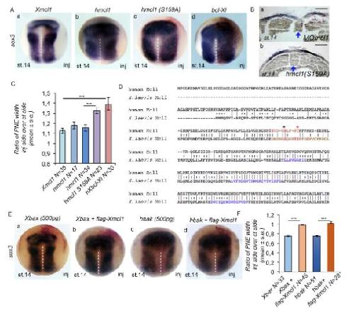 Figure 6: A form of Mcl1 that cannot be phosphorylated by Gsk3β increases the neural plate size with a higher efficiency and compensates the overexpression of the pro-apoptotic proteins XBax and hBak. (A) ISH on stage (st.) 14 embryos using probes against sox3 on embryos injected with (a) Xenopus mcl1-myc (xmcl1), (b) human mcl1 (hmcl1), (c) hmcl1S159A or (d) Xenopus bcl-xl (bcl-xl). (B) Histological sections of MOmcl1- (a) and hmcl1S159A- (b) injected embryos at stage 14 following ISH using sox3 probe and LacZ as a tracer. Blue arrow indicates the notochord. Scale bar stands for 200μm. (C) Quantification of A with addition of mouse mcl1 (mmcl1) mRNA injected embryos. (D) Alignment of human Mcl1 (isoform 1) and X. laevis Mcl1 sequences. In Mcl1 sequence the enriched region in proline (P), glutamic acid (E), serine (S) and threonine (T) residues, referred to as the âproline/glutamic acid/serine/threonine (PEST) region is shown in brown. S155, S159 and T163 shown in red are Gsk3β phosphorylation sites either confirmed in human, or putative in X. laevis. The X. laevis Bcl-2 Homology (BH) domains are shown in blue. In human Mcl1 sequence the black star indicates human S159 and the red star indicates T163. (E) Overexpression of flag-mcl1 compensates for Xbax and hbak overexpression. ISH using sox3 probe was performed at stage 14 Xenopus embryos. Four-cell stage embryos were injected in one dorsal blastomere, either with (a) Xenopus bax (Xbax), (b) Xbax and flag-mcl1, (c) human bak (hBak), and (d) hbak and flag-mcl1 (N= ) mRNAs. LacZ mRNA was used as a tracer of the injected side. Embryos are shown dorsal view anterior up. (F) Quantification of E. PNE stands for posterior neuroepithelium. White dashed lines indicate the midline. N represents the number of embryos. Relative normalized expression is indicated as means ± s.e. ** p<0.01 , *** p<0.001. |