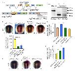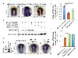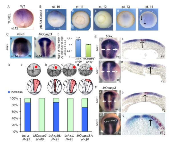 Figure 1: Endogenous apoptosis contributes to axial organizer formation independently of Caspase3 activity (A) TUNEL-staining reveals apoptosis in the axial midline. Representative TUNEL-stained wild type (wt) stage (st.) 12 Xenopus embryos. (B) Activated Caspase-3 (Act-Casp3) is not detected before stage 14 in Xenopus embryos. Representative immuno-staining against Act-Casp3 performed on st.10 to st.14 embryos. Act-Casp3 positive nuclei are shown with black arrows; st.10 to 12 ventral view dorsal up; st. 13 and 14 dorsal view anterior up. (C-F) Endogenous apoptosis affects establishment of the posterior neural plate via its activity on axial organizer signaling independently of Casp3. (C) Xenopus embryos were injected into one dorsal blastomere at the four-cell stage with mRNA encoding (a) X. laevis bcl-xl or (b) MOcasp3 together with a tracer (red) and analyzed by ISH with sox3. Representative st.14 embryos are shown. (c) Quantification graph of (a, b). (D) Xenopus embryos were injected into one dorsal blastomere at the four- (a), sixteen- (b, c) or thirty-two- (d) cells stage with mRNA encoding X. laevis bcl-xl or MOcasp3 together with a tracer (red) and analyzed by ISH with sox3. The site of injection (red dot), and the corresponding st.14 targeted territory (red area) are represented. The graph indicates the % of embryos exhibiting the (a-c) posterior, or (d) anterior, neural plate enlargement phenotype (blue). ML: medio-lateral; L: lateral; A: anterior neural plate. (E, F) Bcl-XL acts on the axial organizer cells. Embryos were injected either in the axial organizer (notochord and floor plate) or in lateral ectoderm with (E) bcl-xl or (F) MOcasp3. Representative embryos are shown dorsal view, anterior up, except (Fc) shown dorsal-anterior view. Representative transverse sections (50μm) are shown at the antero-posterior axis positions indicated with a white-dashed arrow (Eb,d; Fb,d). The black arrow indicates the limits of the injected territory. PNE: posterior neuroepithelium. Inj: injected side. White dashed lines indicate the midline. Relative normalized expression is indicated as means ± standard error (s.e.) *** p<0.001. |