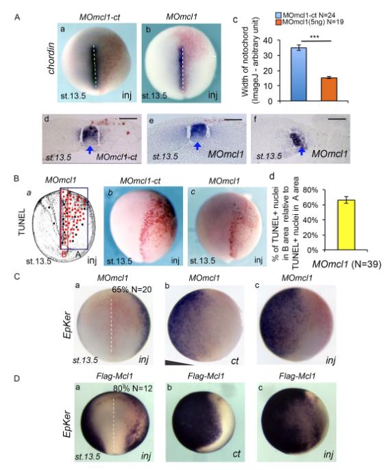 Figure 4: Mcl1 depletion specifically affects the survival of notochord cells. (A) Depletion of Mcl1 affects notochord development. ISH of stage (st.) 13.5 embryos using probes against chordin (a,b). Embryos injected (inj) with (a) MOmcl1-ct (N=24); or (b) MOmcl1 (N=19); (c) Quantification graph showing notochord width comparison in embryos injected with MOmcl1-ct or MOmcl1. (d-f) Histological vibratome sections of respectively (d) MOmcl1-ct and (e,f) MOmcl1. Blue arrow indicates the notochord. Scale bar stands for 200μm. (B) Quantification of midline apoptosis induced by Mcl1 depletion. TUNEL staining was performed at st.13.5. (a) Schematic representation of TUNEL quantification: red dots represent injected cells; black dots represent TUNEL positive cells. All apoptotic cells were counted in (A) the black rectangle considered the total injected area, and (B) the red rectangle considered the midline area. (b, c) Representative TUNEL staining on stage 13.5 embryos injected with (b) MOmcl1-ct; or (c) MOmcl1 (N=39). (d) Quantification of B. (C, D) The decrease in neural plate width upon depletion of Mcl1 is mirrored by the increase in ectoderm territory. ISH against epidermal keratin (EpKer). Representative stage 13.5 embryo injected with (C) MOmcl1-1; (D) flag-mcl1; (a) dorsal view anterior up; (b) View of the non-injected side: lateral view, anterior up, dorsal side right; (c) View of the injected side: lateral view, anterior up, dorsal side |